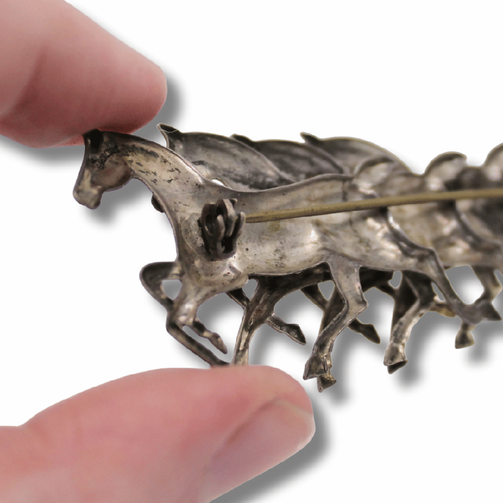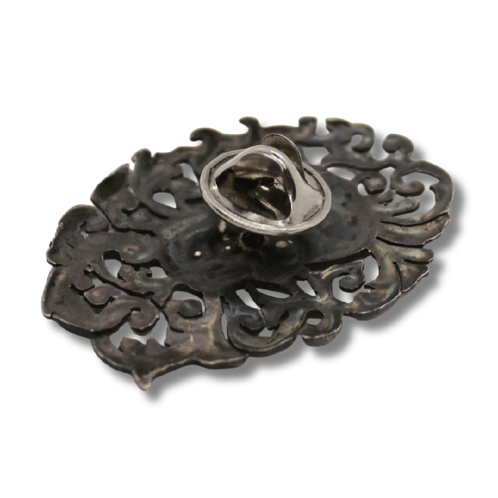 It started as a sturdy needle set tightly against the brooch, leaving little room for jostling, but we eventually began incorporating hooks, and later clasps, for further security. In many Victorian-era brooches, the clasp that holds the needle in place was sometimes embellished as a spiral. The brooch allows for endlessly creative pin design, since it's not limited by the size or shape of the design.