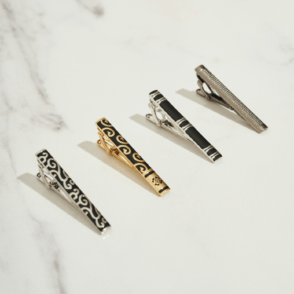 The clip consists of a hinge and two long bars, which a piece of fabric is slipped between, allowing one to secure the tie without marring the fabric in a manner similar to a bobby pin. Clip pins can certainly be made yourself (as long as you’re not intimidated by using hinges). They’re great candidates for repurposing our patterned band and antique bar pin impression dies.