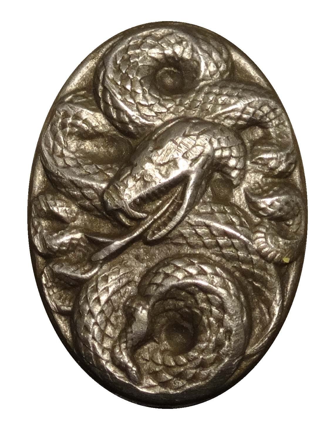 This locket or ring top depicts a snake curling in on itself. From Larter & Sons. Design: 1/2" x 3/4"