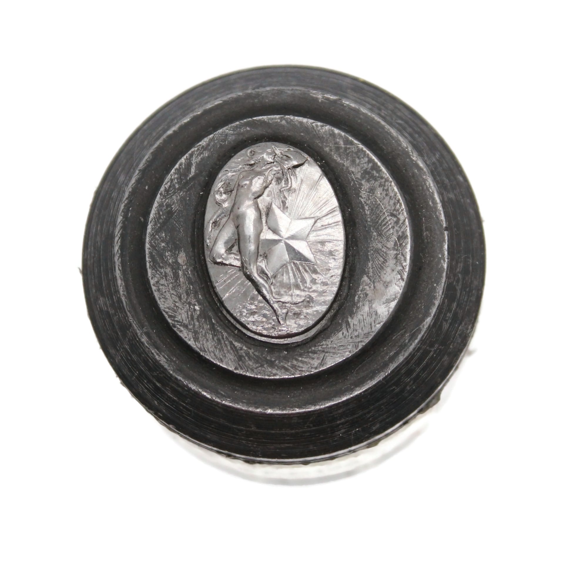 This classic button shows a woman shepherding the sun over the sea. Reunite her with her sister, "Evening Star," is you can find her! From the Parisi Tool & Die Co.