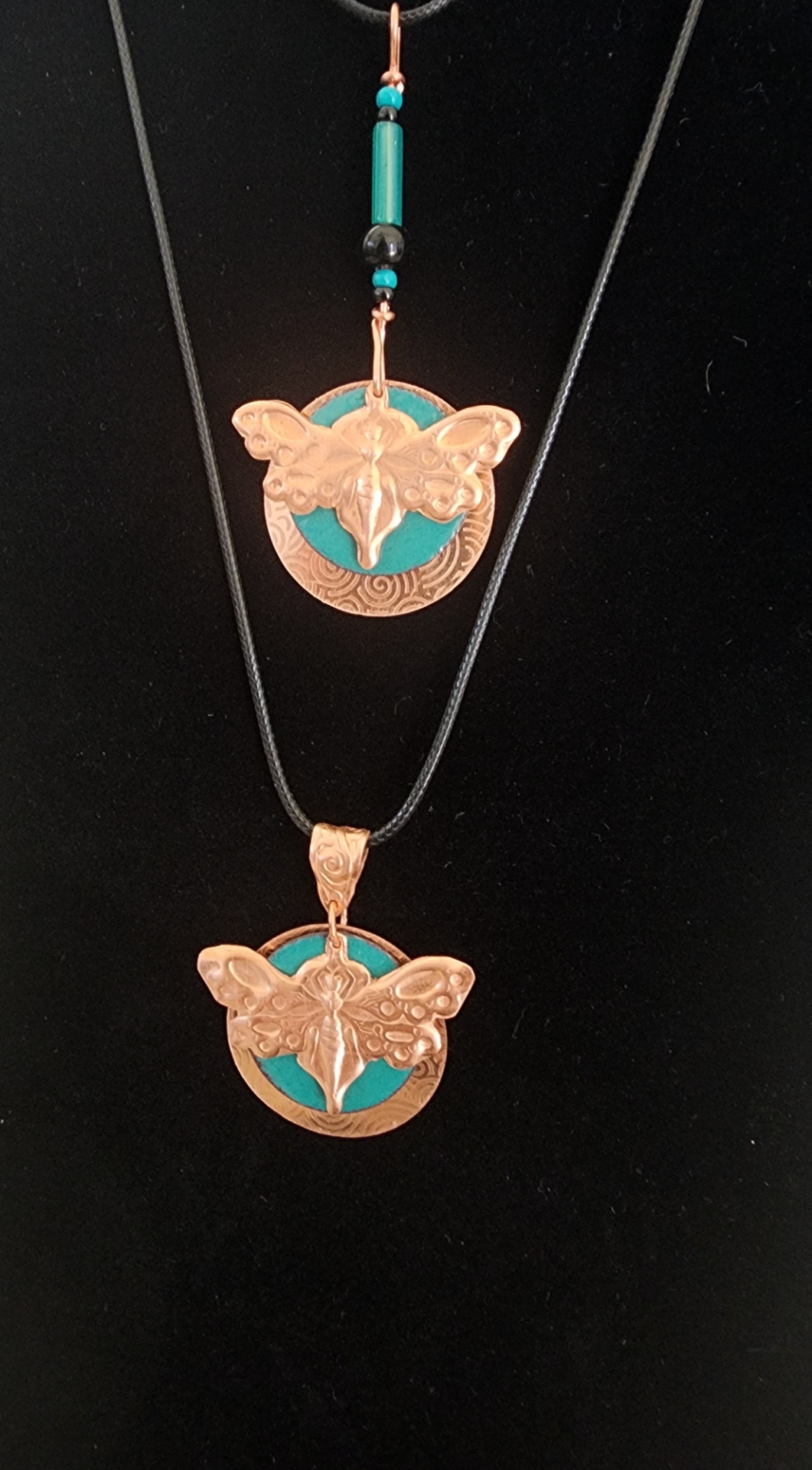 Copper Enamel Pendant/Necklace In-person class - 10am-3pm Instructor: Sheryl Haupt Date: March 20th, 2026 Level: All Levels All tools and materials included. The classroom is located at 1949 E. Eastland, Tucson, Arizona, 85719. This class is for beginner and intermediate students. In this one day class, students will create a stunning pendant or necklace. The pendant will be layered with textured copper and enamel discs, overlayed with a copper moth. The bail is made from a Potter USA die. If you choose to make the necklace instead, you will create the bail using beads and copper wire. Basic sawing and filing experience will be helpful.