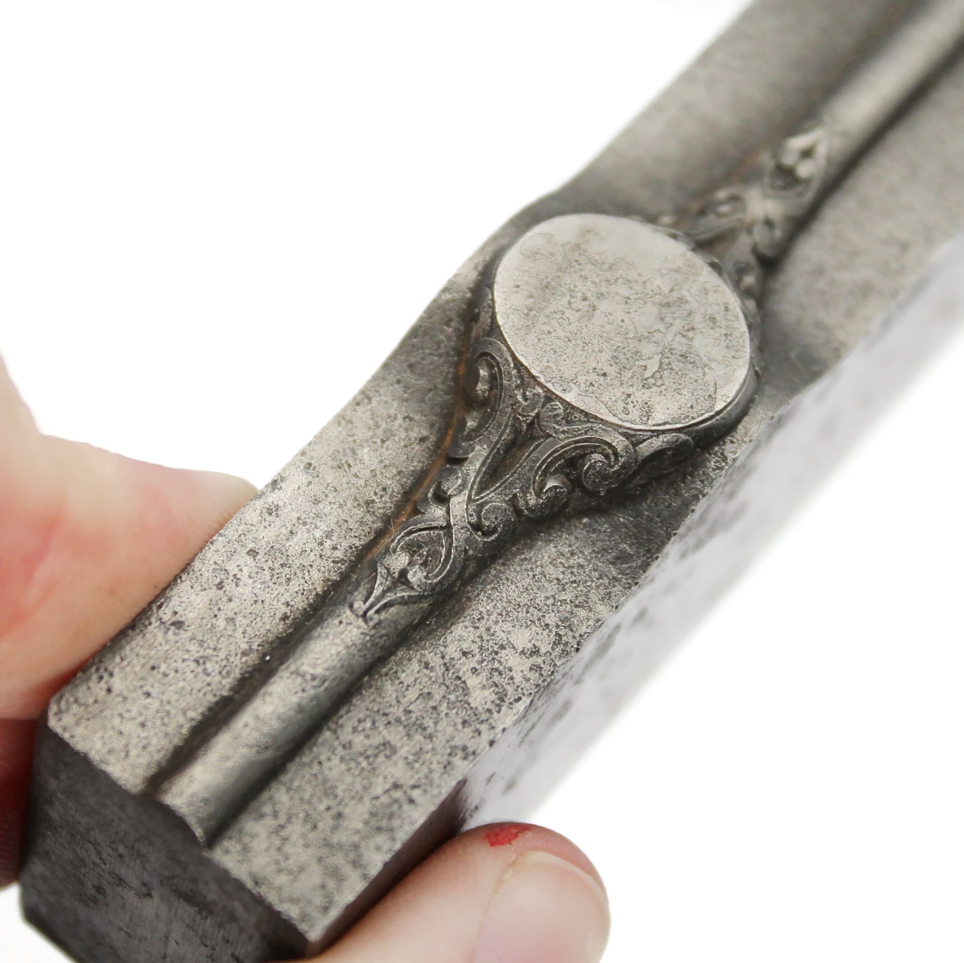 A humpback ring (use with a high humpback former) with a curly design. From Foster & Bailey.