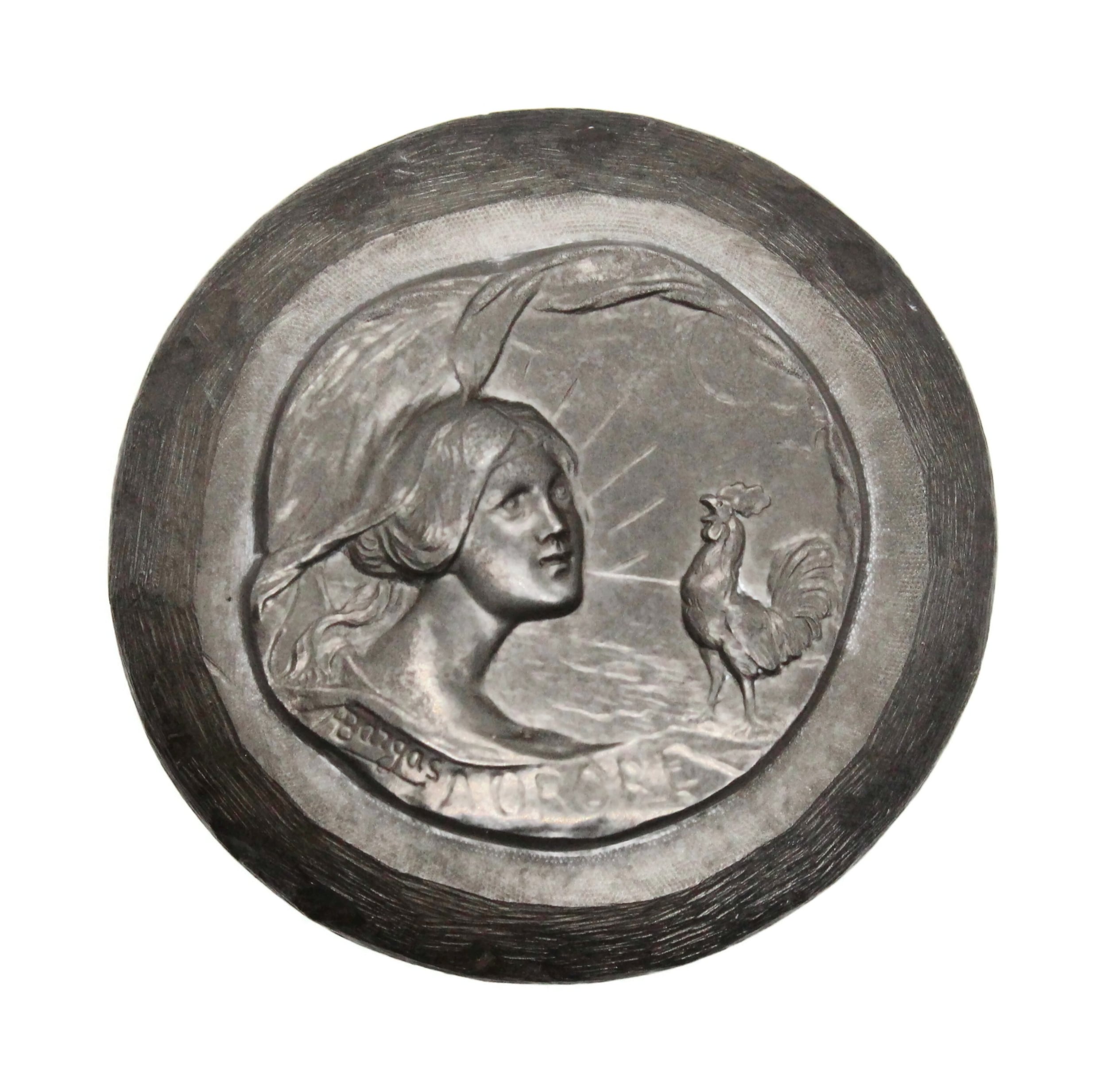 Original design by Armand Bargas, Paris, France. The impression die depicts a woman and a crowing rooster, with the word "Aurore" (Dawn) engraved below them. This design was part of a series designed by Bargas representing different times of day. The series also includes Jour (Day), Crepuscule (Twilight), and Nuit (Night). 1-1/4" diameter
