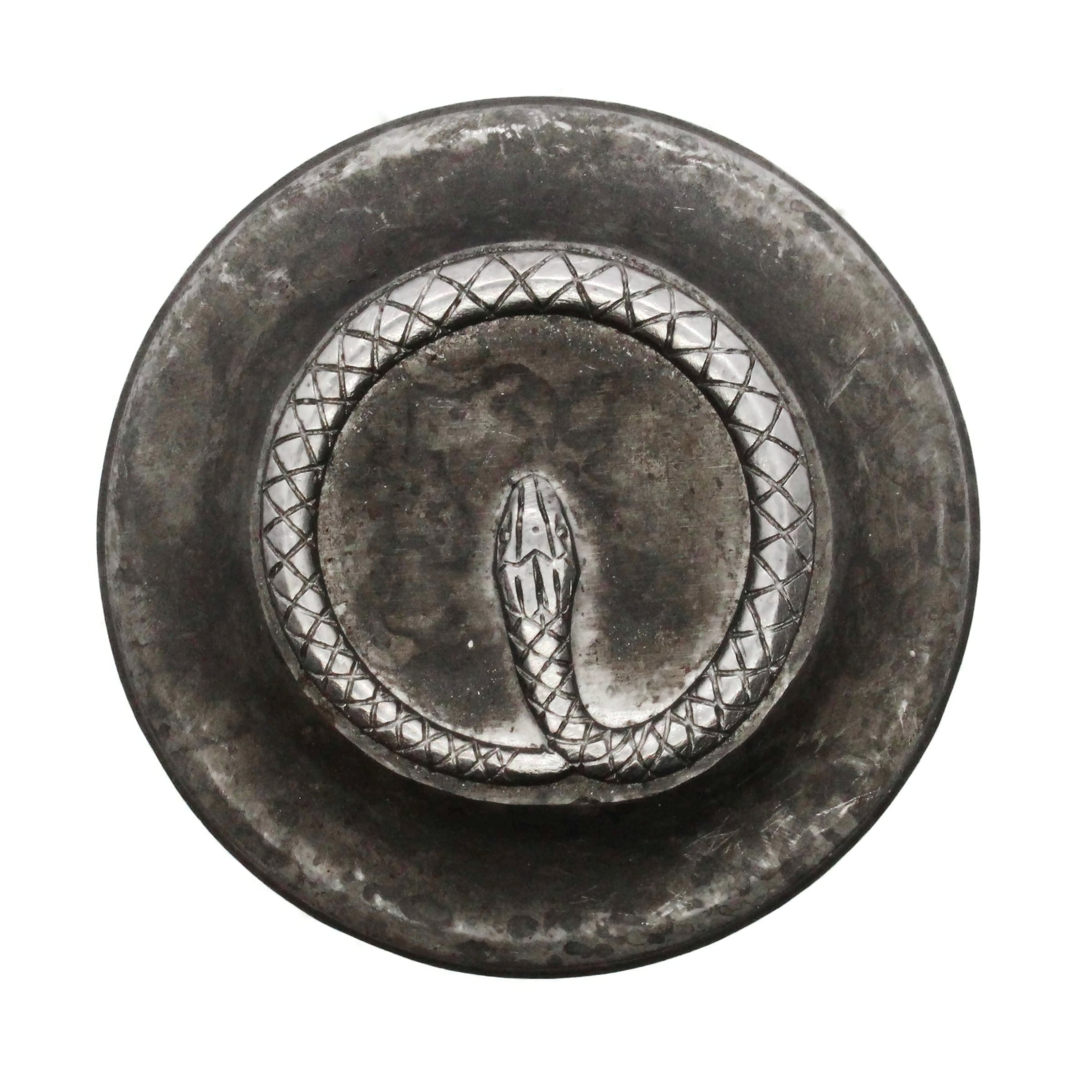 This fanged serpent is curling into itself. This design makes a great gothic ring top, small locket, or button. From Larter & Sons. Design: 3/4" x 1/2"
