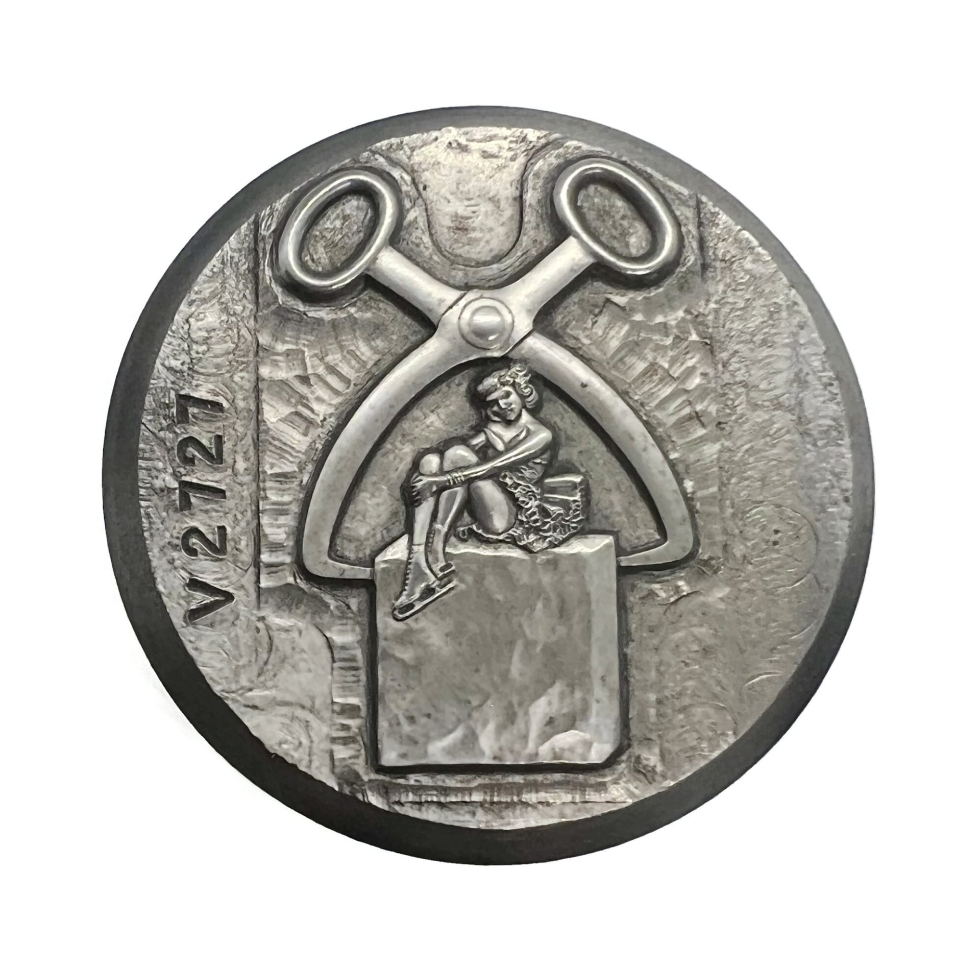 A detailed impression die with a woman sitting on a cube of ice.