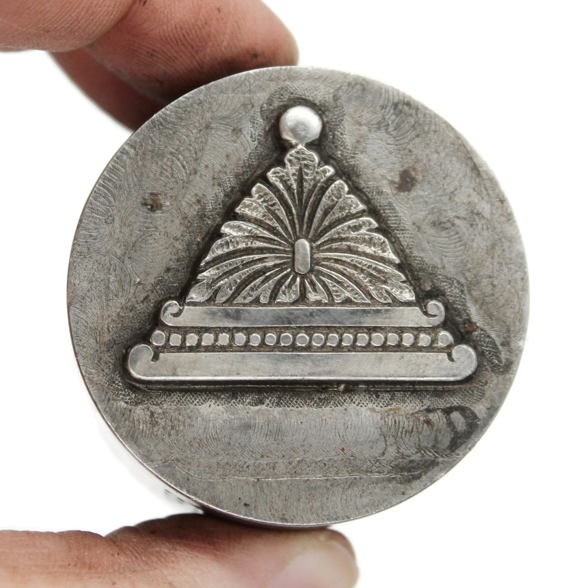 An intentionally rough-pattern of brick or stone-like chevrons resembling ruins or collapsing columns. Looks beautiful in any metal. From Helsinki, Finland.