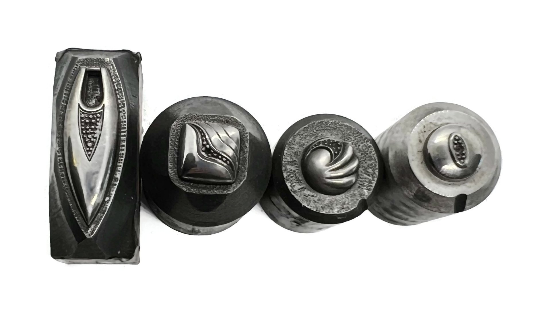 A selectin of four complementary impression dies that have small stone settings. They would make great pendants or earrings. Made by Bruening