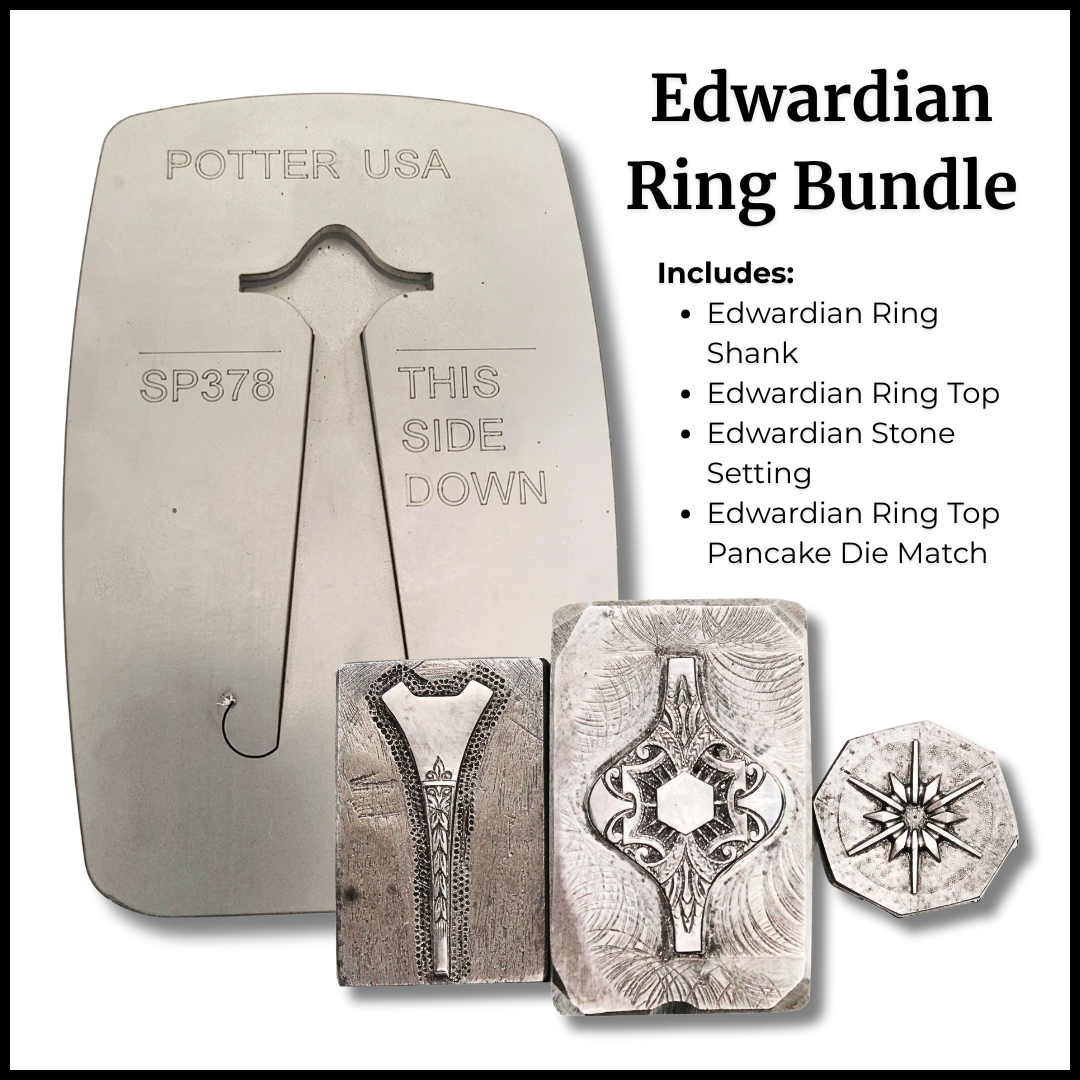 This ring set includes impression dies for a ring shank (use 2 pressings to make a complete ring), ring top, and a claw setting for a stone. It does not include the pancake die, which can be bought separately or as part of a bundle. The original hubs are from Carter and Gough, early 1900's. Sample by John Jellies.