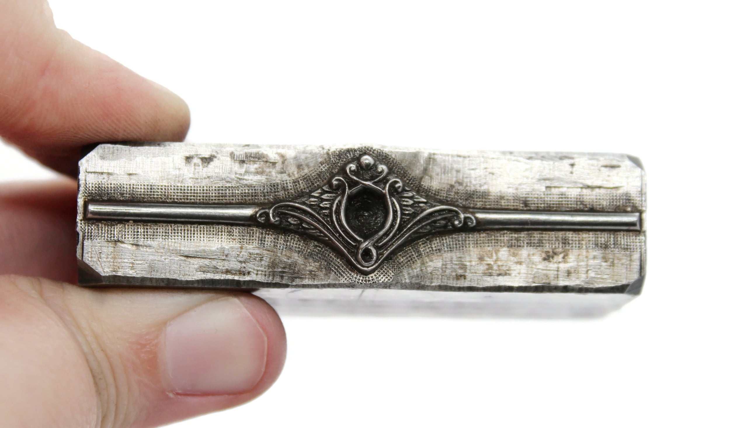 A large collectible spoon handle. From a collection of dessert spoons engraved with realistic fruits. This spoon depicts olives.