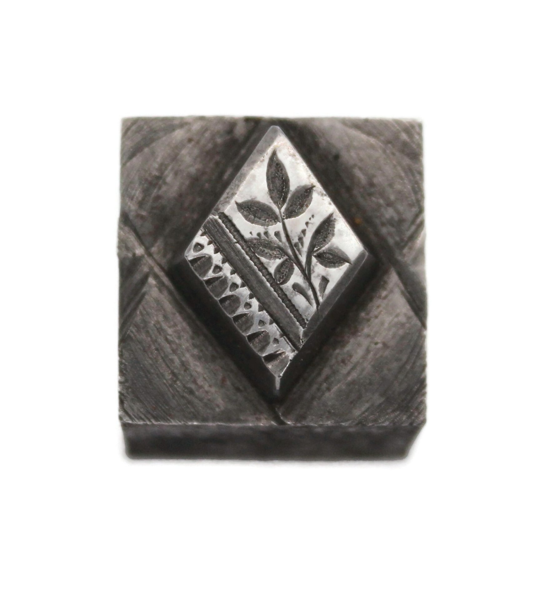 A diamond-shape button or component engraved with leaves and one ruffled edge. From Eagle Tool.