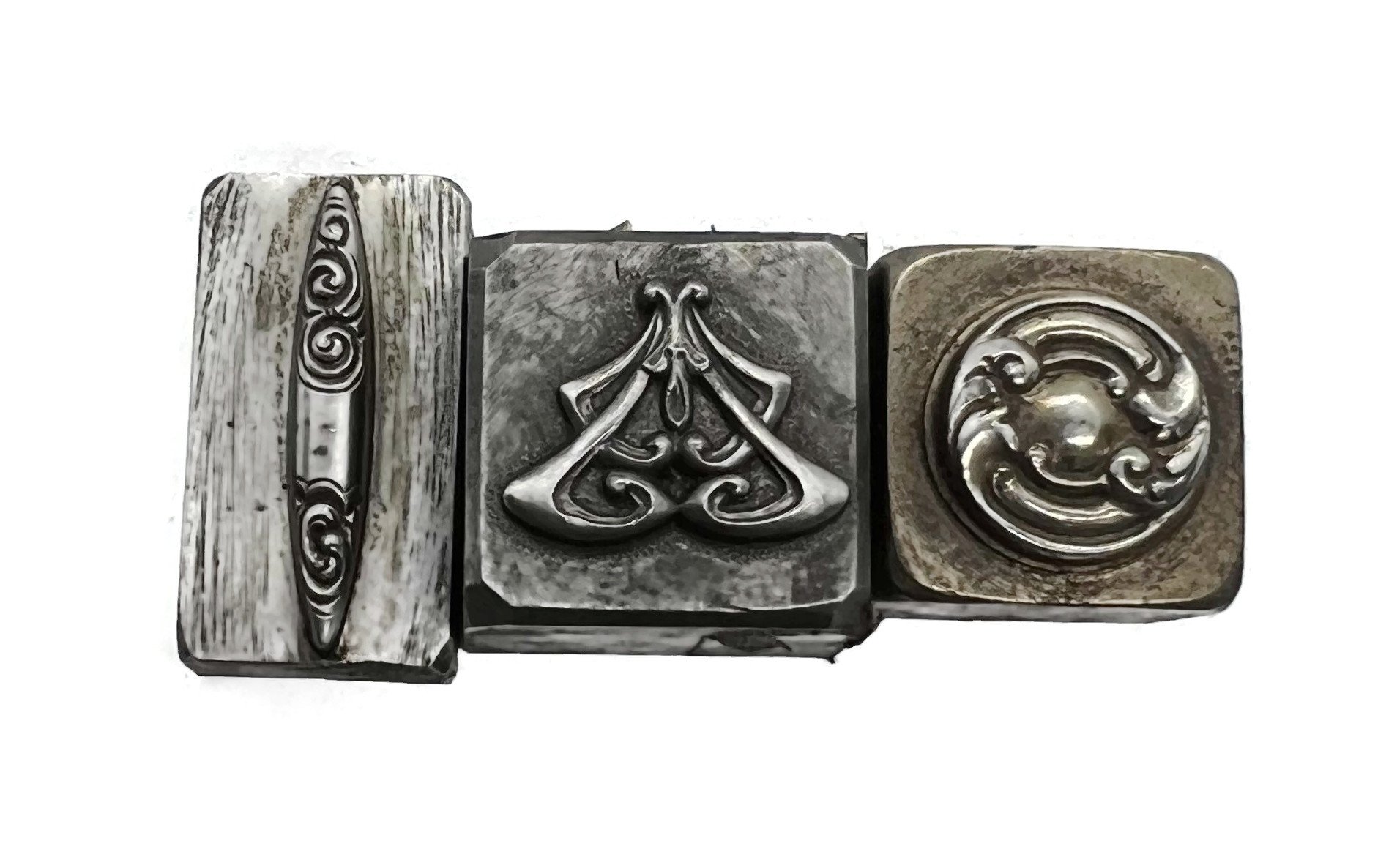 A shot plate with three impression dies that have flourishes. They can be used as pendants, earrings, ring tops and more.