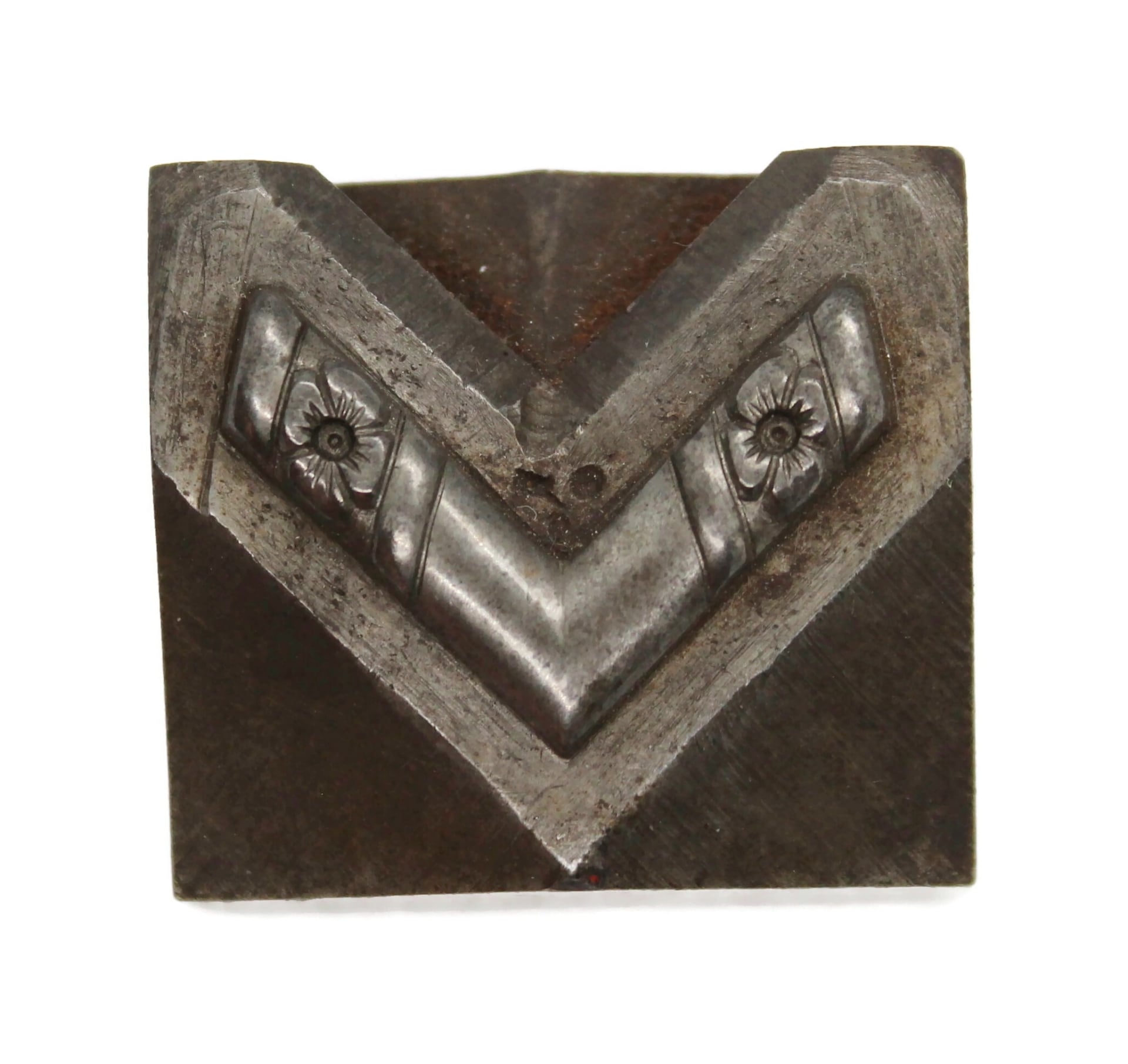 A Frank Morrow chevron-shaped component. The design is simple with two flowers engraved on the ends.