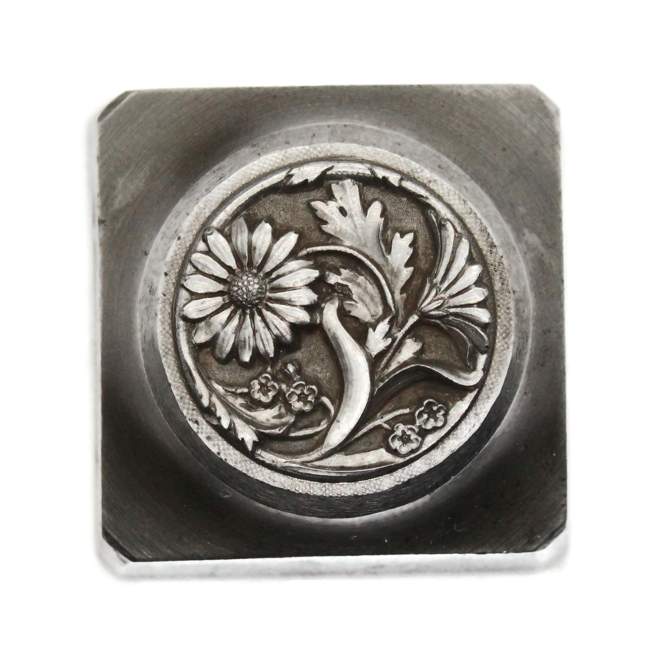 This vignette depicts a daisy with its own stem wrapping around the frame. It has a smaller version available. From Villemin in Paris, France. Design: 1-1/16" diameter