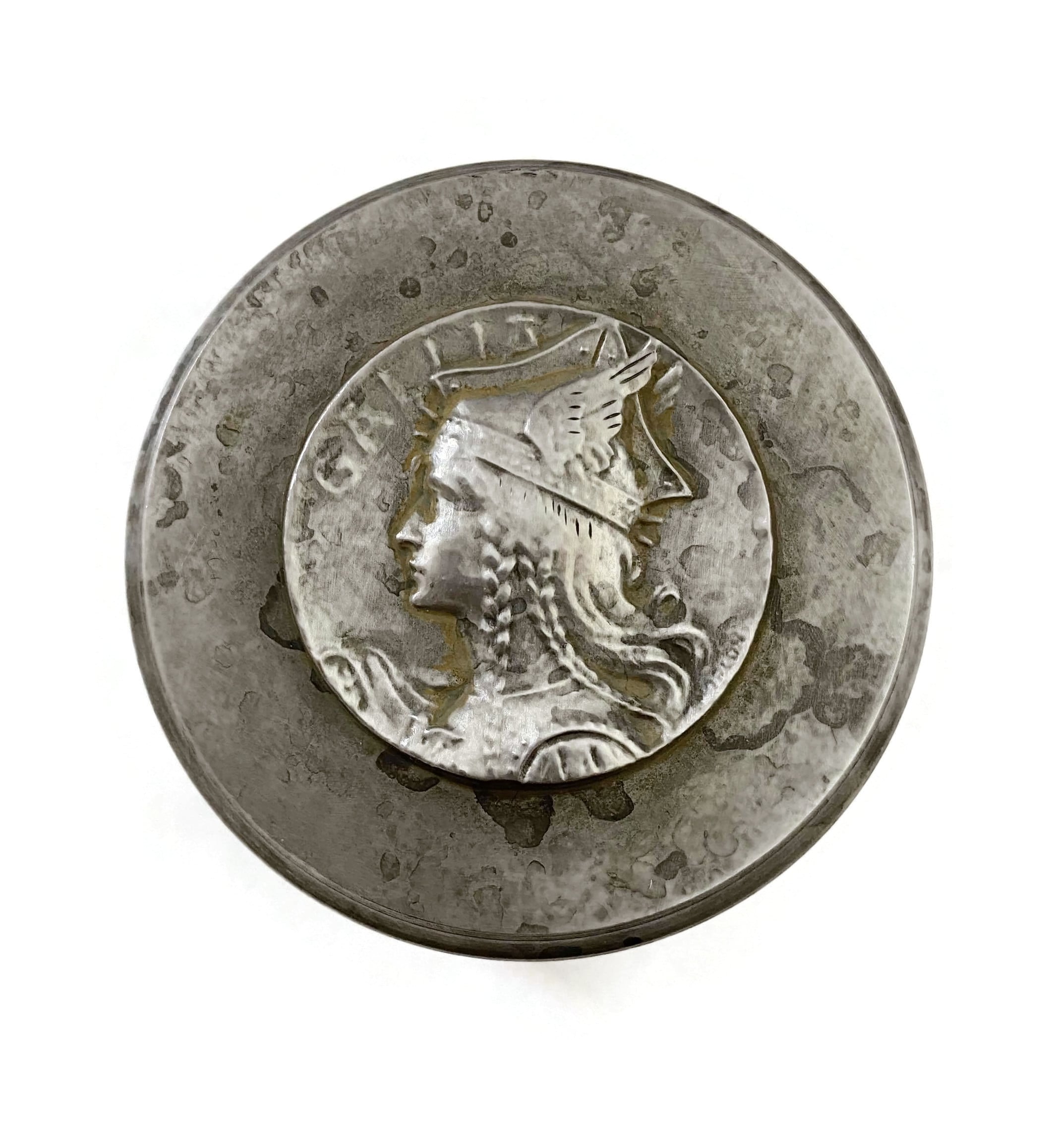 This medallion depicts Gallia, a Romano-Gallic goddess of the region of Gaul, which encompassed much of modern day France to Northern Italy. There is no known information about the goddess besides her name and the region to which she was dedicated, but images of her were popular on coins and medallions in 19th-century France. Impression die from Paris, France. Design: 1-3/16" diameter