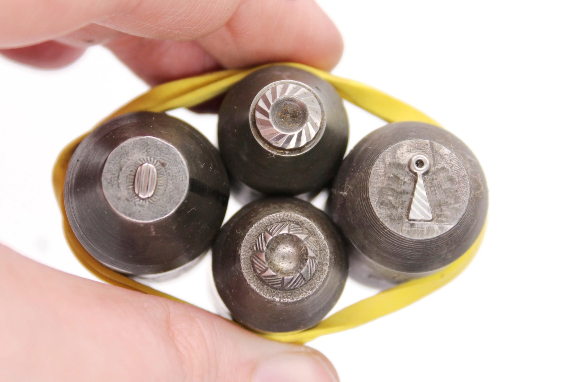 A quartet of small striped components including charms, bezels, and a small oval stud. From Breuning (Pforzheim, Germany).
