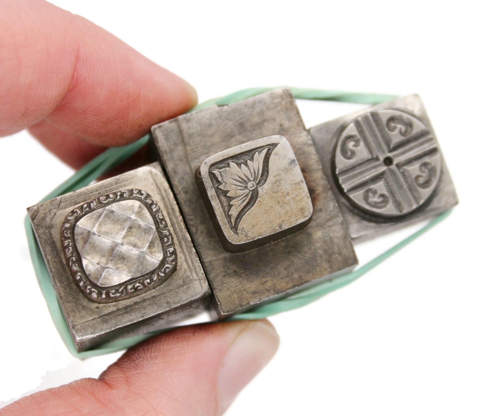 A belt buckle or handle made of beads. Solder two stampings together to make a three-dimensional design. From Larter & Sons.