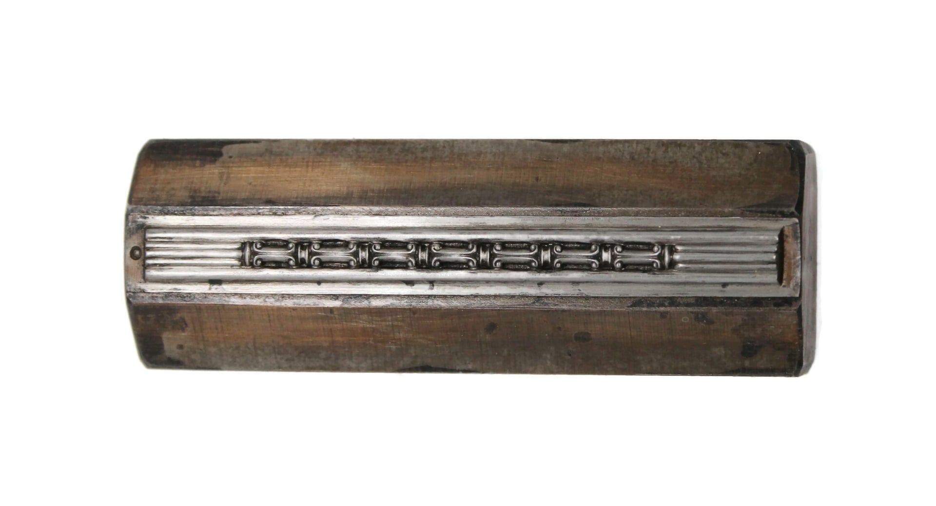 A Larter & Sons ring band engraved with laurel leaves and a minor meander pattern, with a setting for a small stone. It was originally used as a bar brooch for hair and clothing.