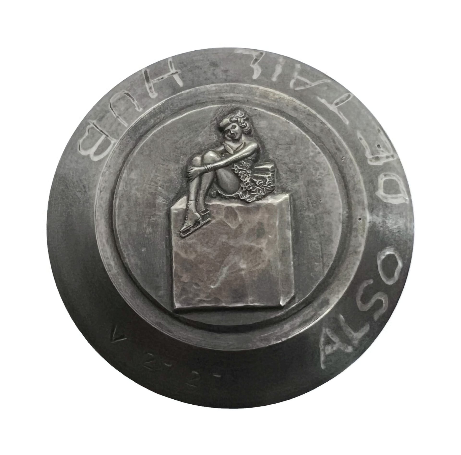 A detailed impression die with a woman sitting on a cube of ice held with ice block tongs.