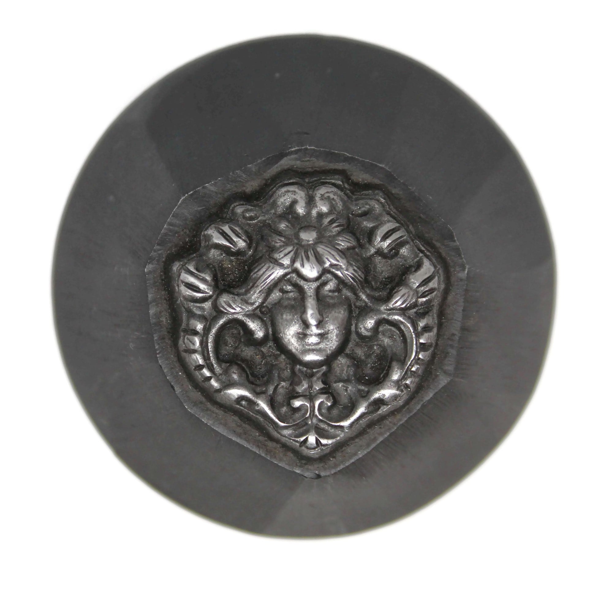 An impression die looking straight forward at a woman's face with a flower in her hair. An art nouveau piece.