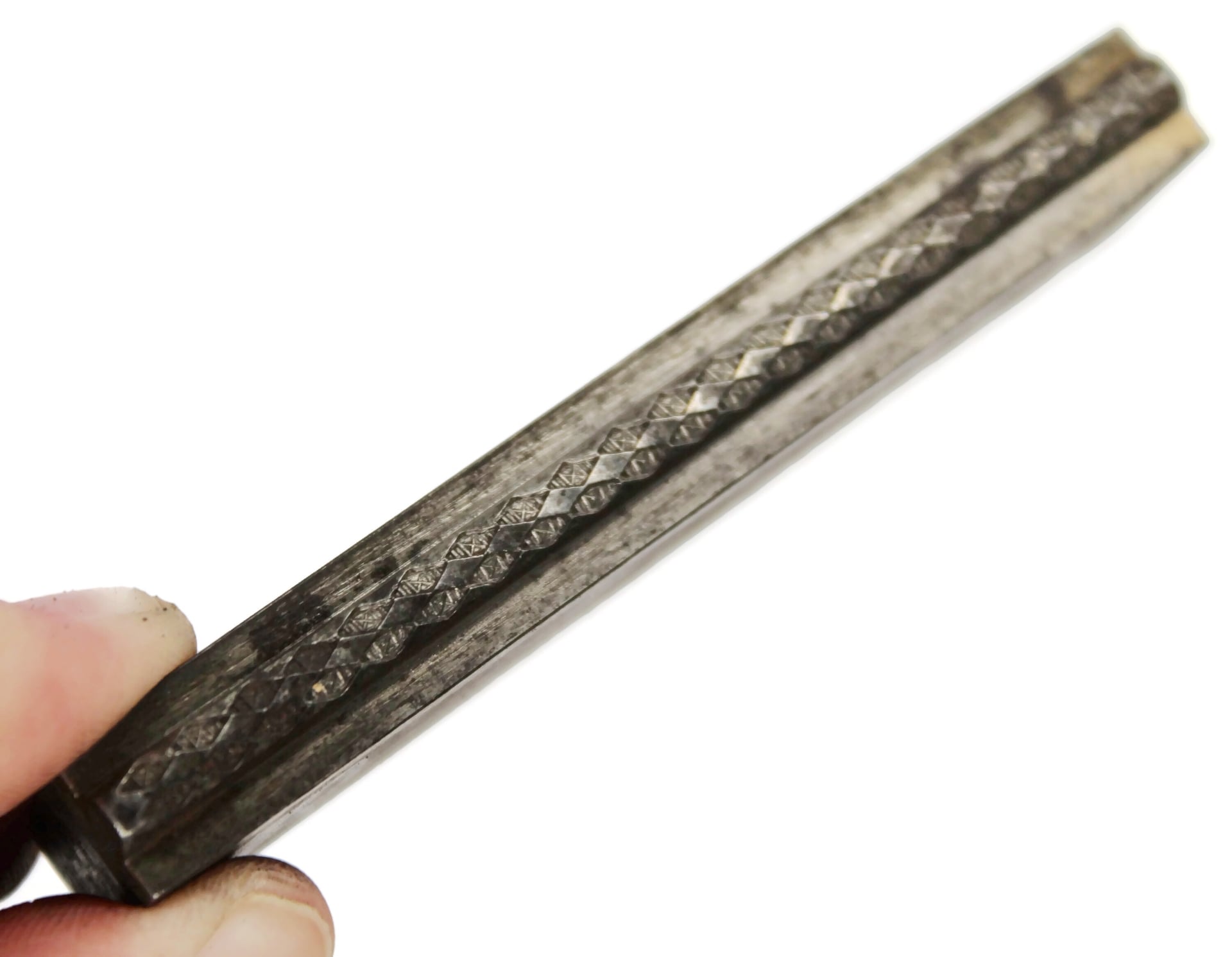 This domed patterned band is engraved with a continuous pattern of convex and recessed/engraved diamond shapes. The recessed diamond shapes can be set with stones or enameled to highlight the fine engravings inside. From the Frank Morrow Co.