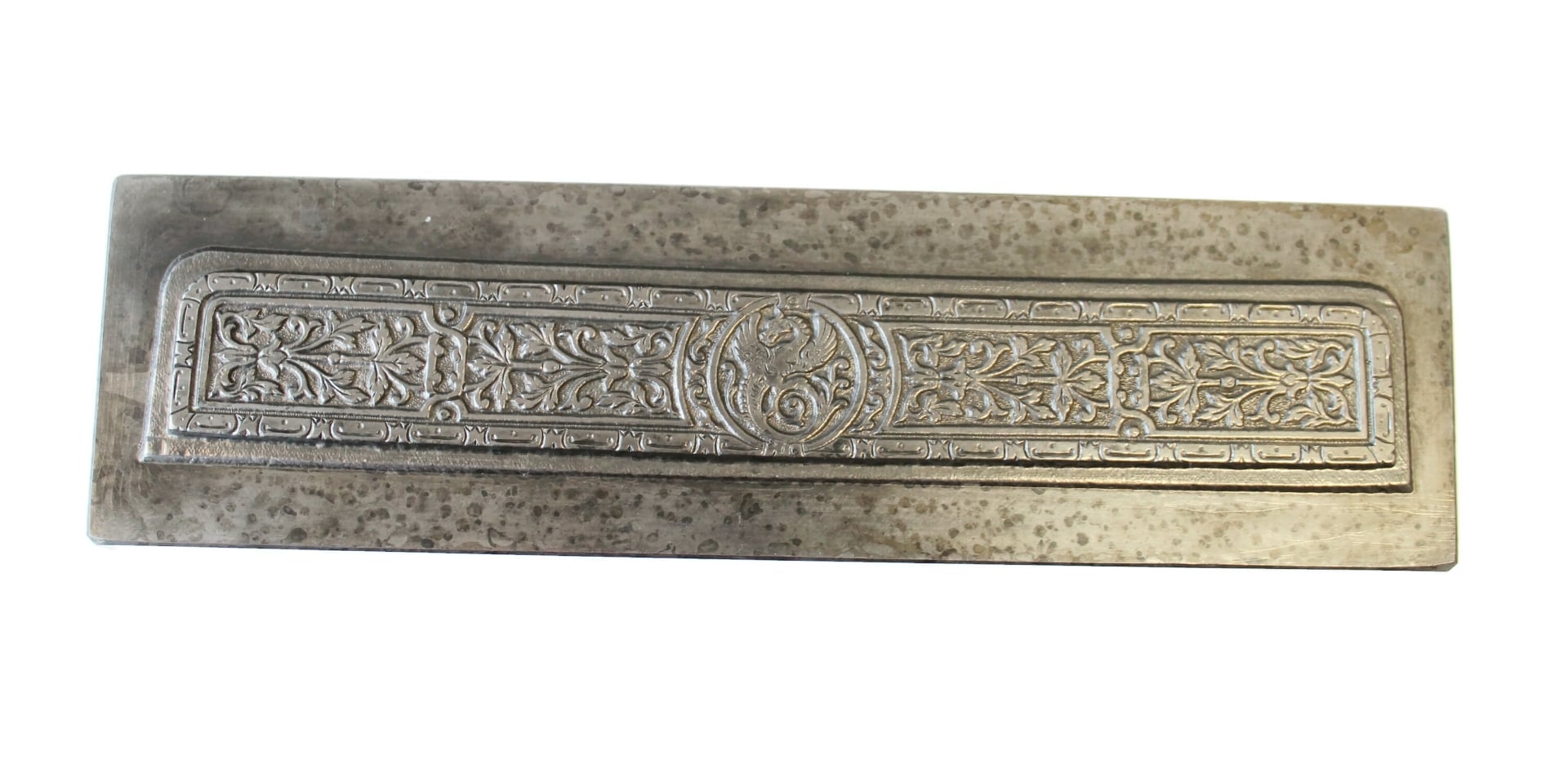 This bracelet was made from a galvano belonging to La Forge in Paris, France. It depicts a stylized dragon flanked by Baroque-inspired patterns.
