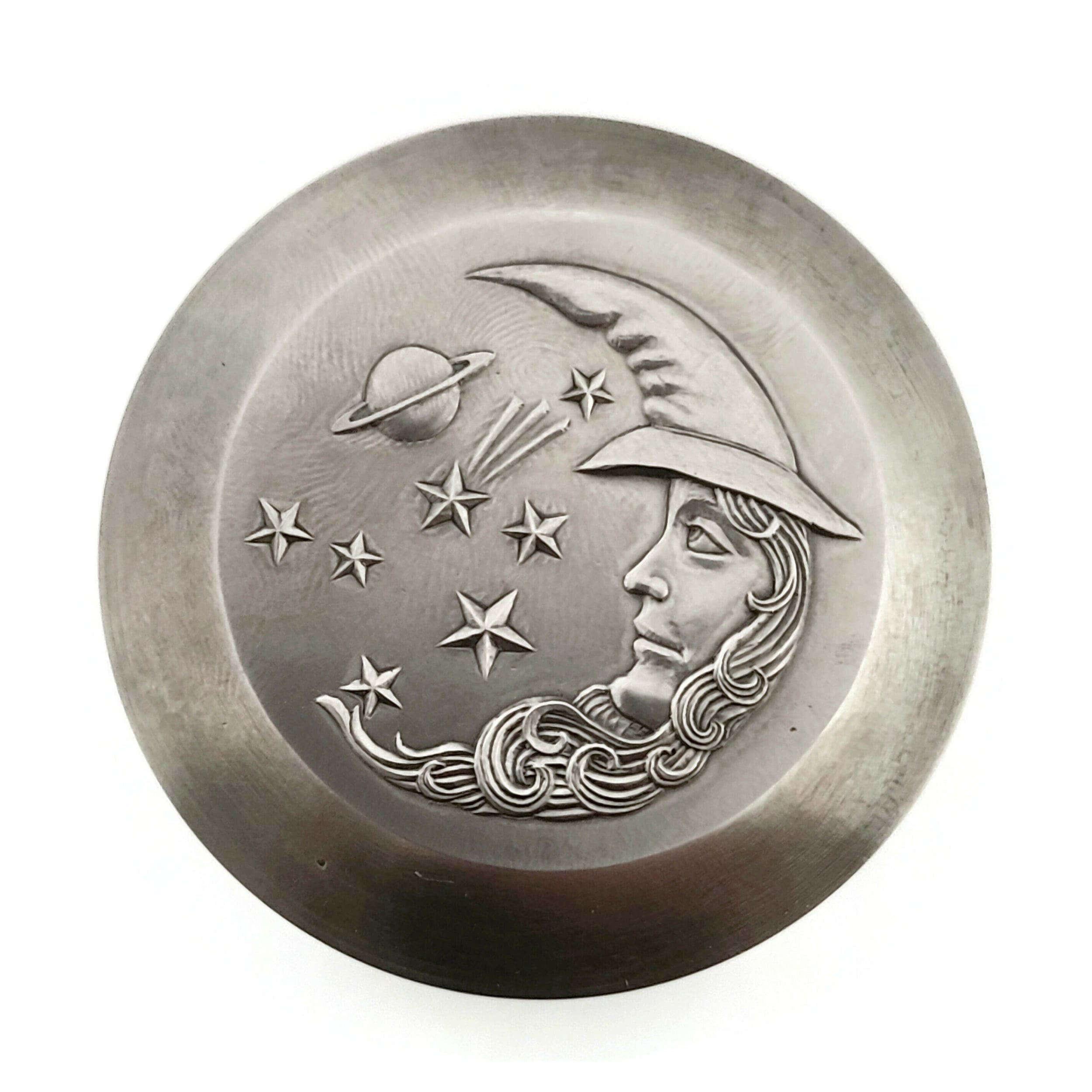 Image is 1 3/8" in diameter. Moon is 1 3/8" High and from back of moon to the farthest star, it is 1 3/8" This impression die will be on a 2.5" or 3" die.