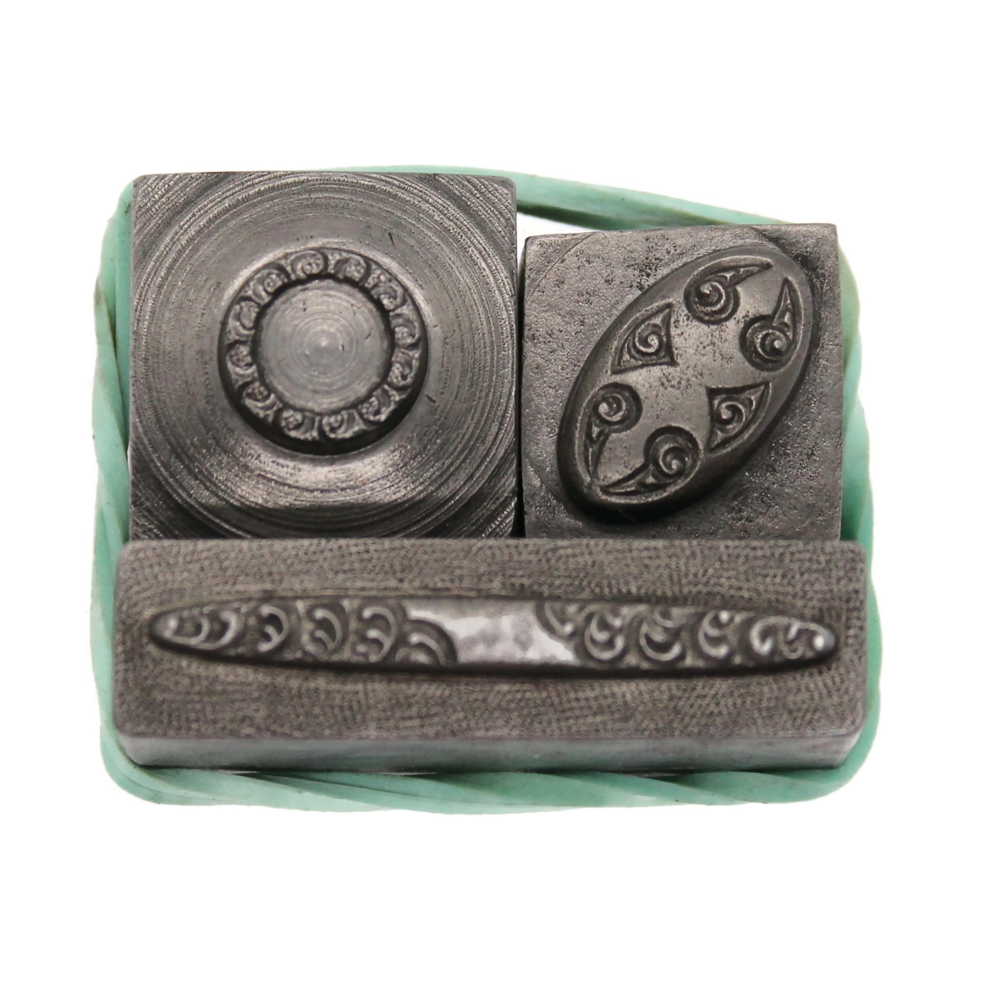 A trio of matching curl impression dies: a bail, a ring top or button, and a bezel. All from Foster & Bailey (Providence, RI).