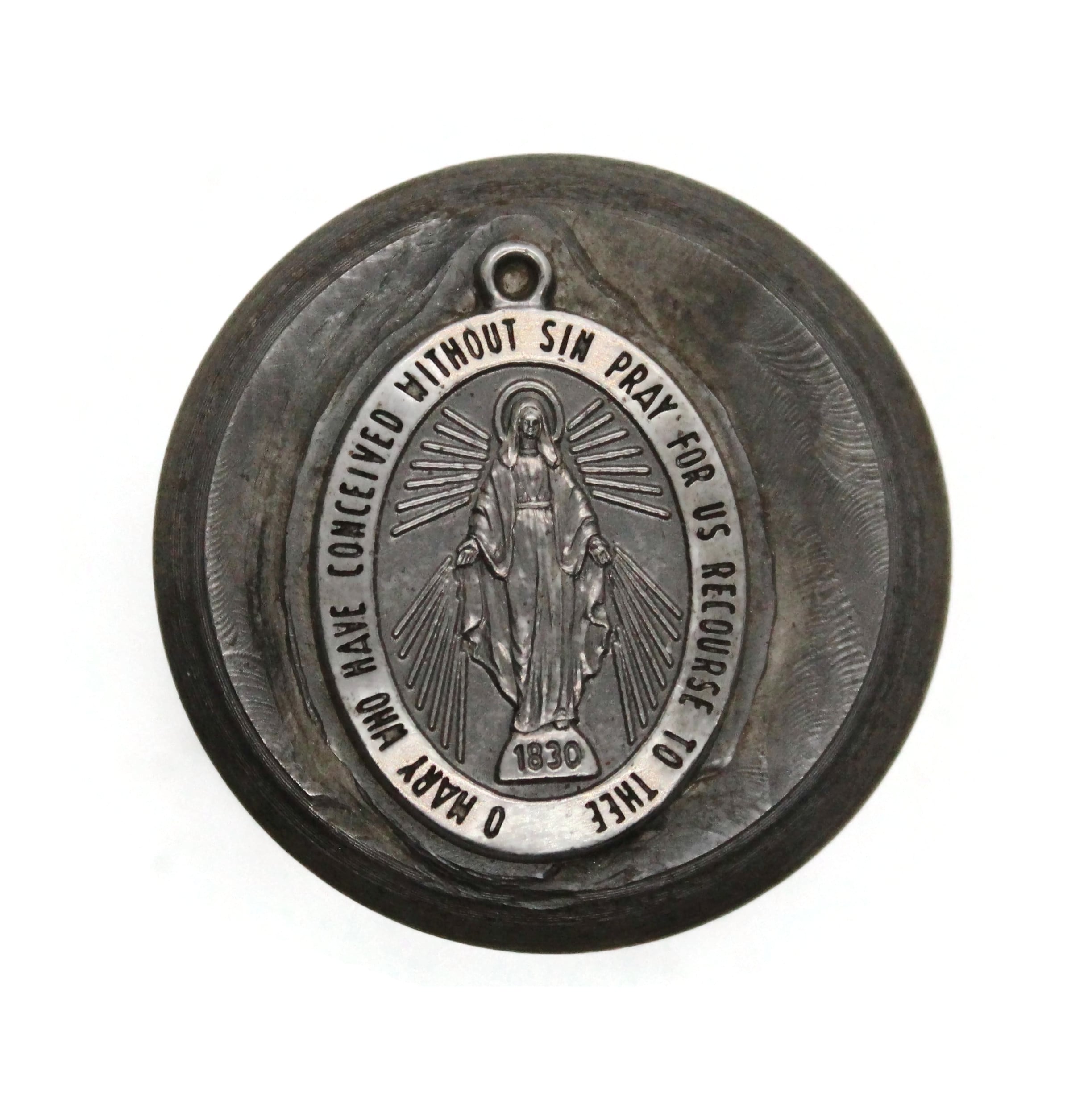 This charm depicts the virgin Mary. Her figure stands on the year "1830." The words around the charm's edge read: "O MARY WHO HAVE CONCEIVED WITHOUT SIN PRAY FOR US RECOURSE TO THEE." From Silveri. Design: 3/4" x 1"