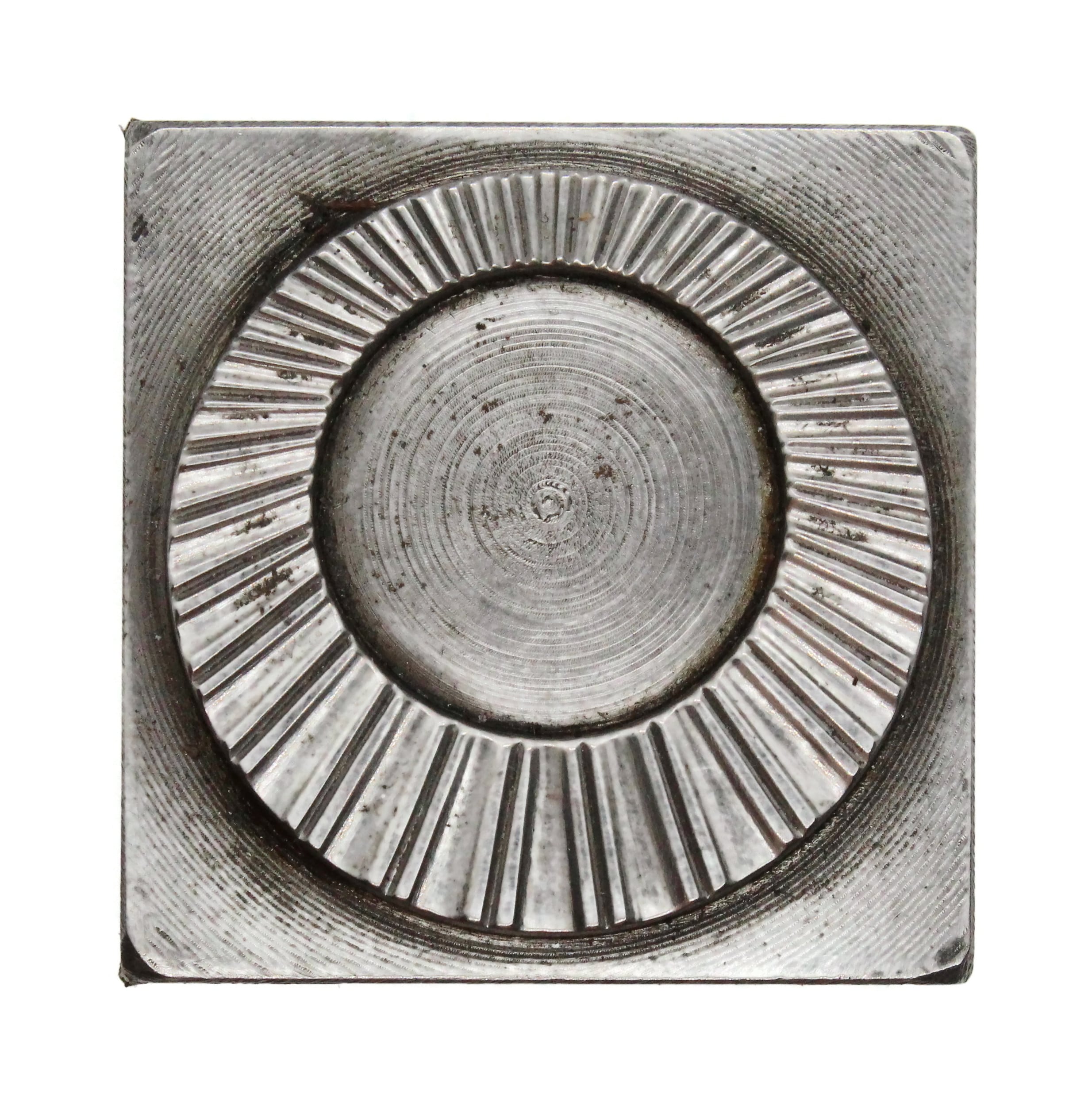 Approx. 16 gauge (Due to supply challenges, gauge may vary.) Design: 1-1/4 diameter NOTE: Each stamping is made in house, one at a time, using vintage tools and processes. The detail in each stamping may vary, and a stamping with less detail is not considered defective.