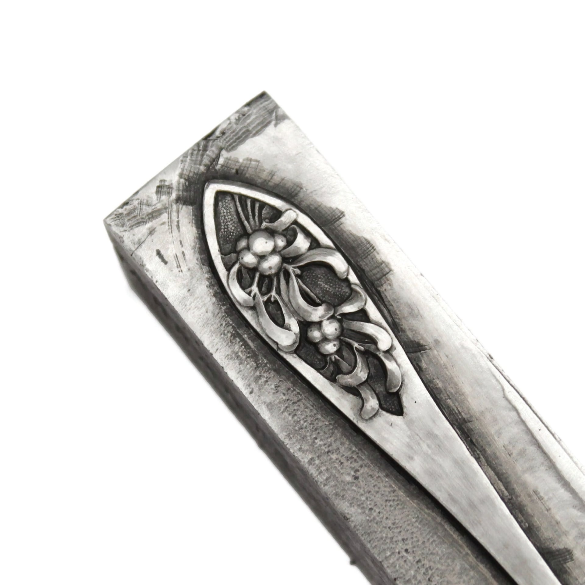 A large collectible spoon handle. From a collection of dessert spoons engraved with realistic fruits. This spoon depicts olives.