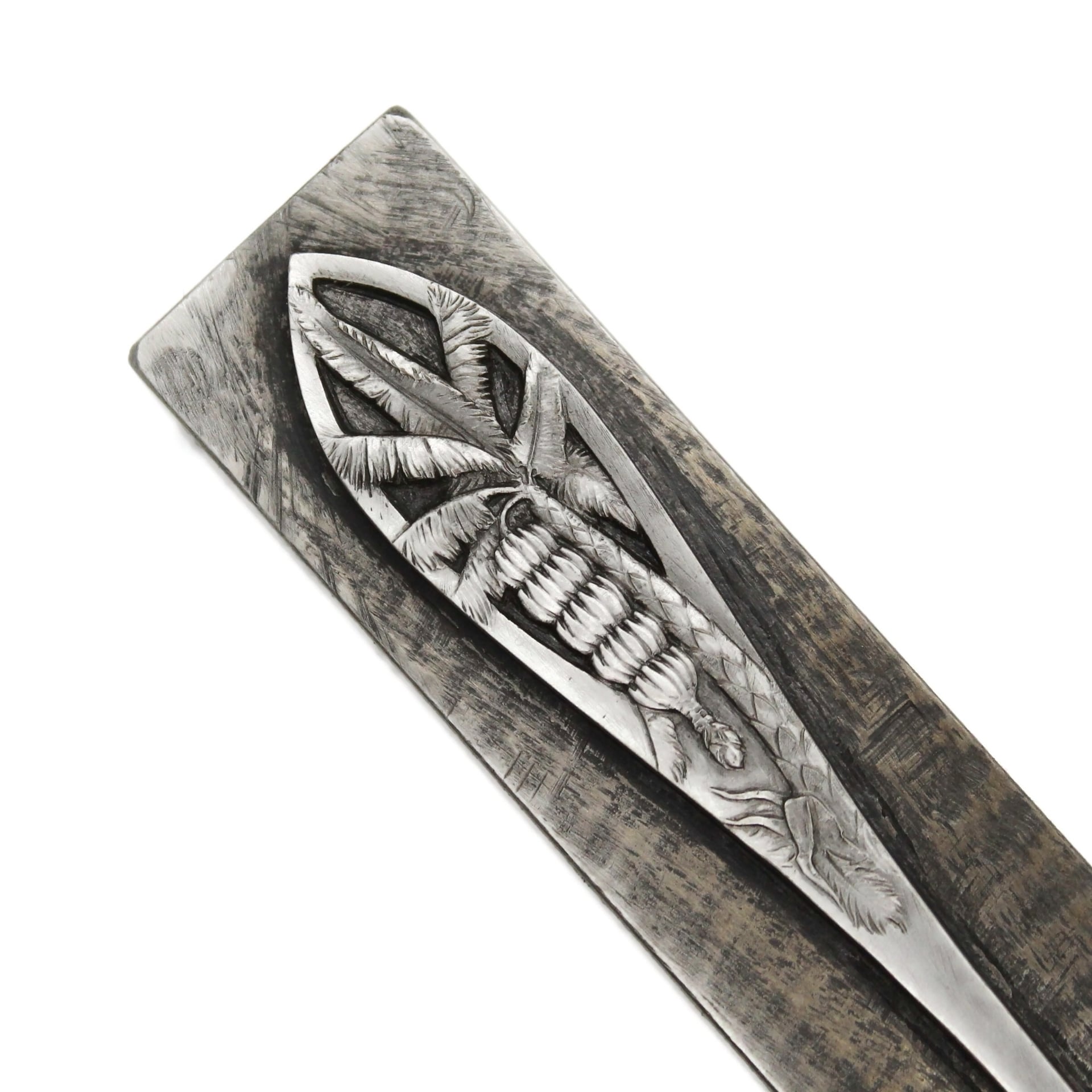 A small collectible spoon handle. From a collection of dessert spoons engraved with realistic fruits. This spoon depicts plantains/bananas, pears, and pineapples.
