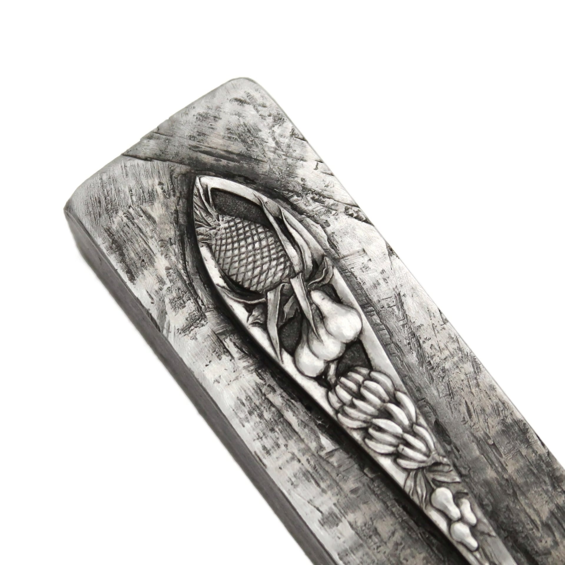 A large collectible spoon handle. From a collection of dessert spoons engraved with realistic fruits. This spoon depicts plantains/bananas.