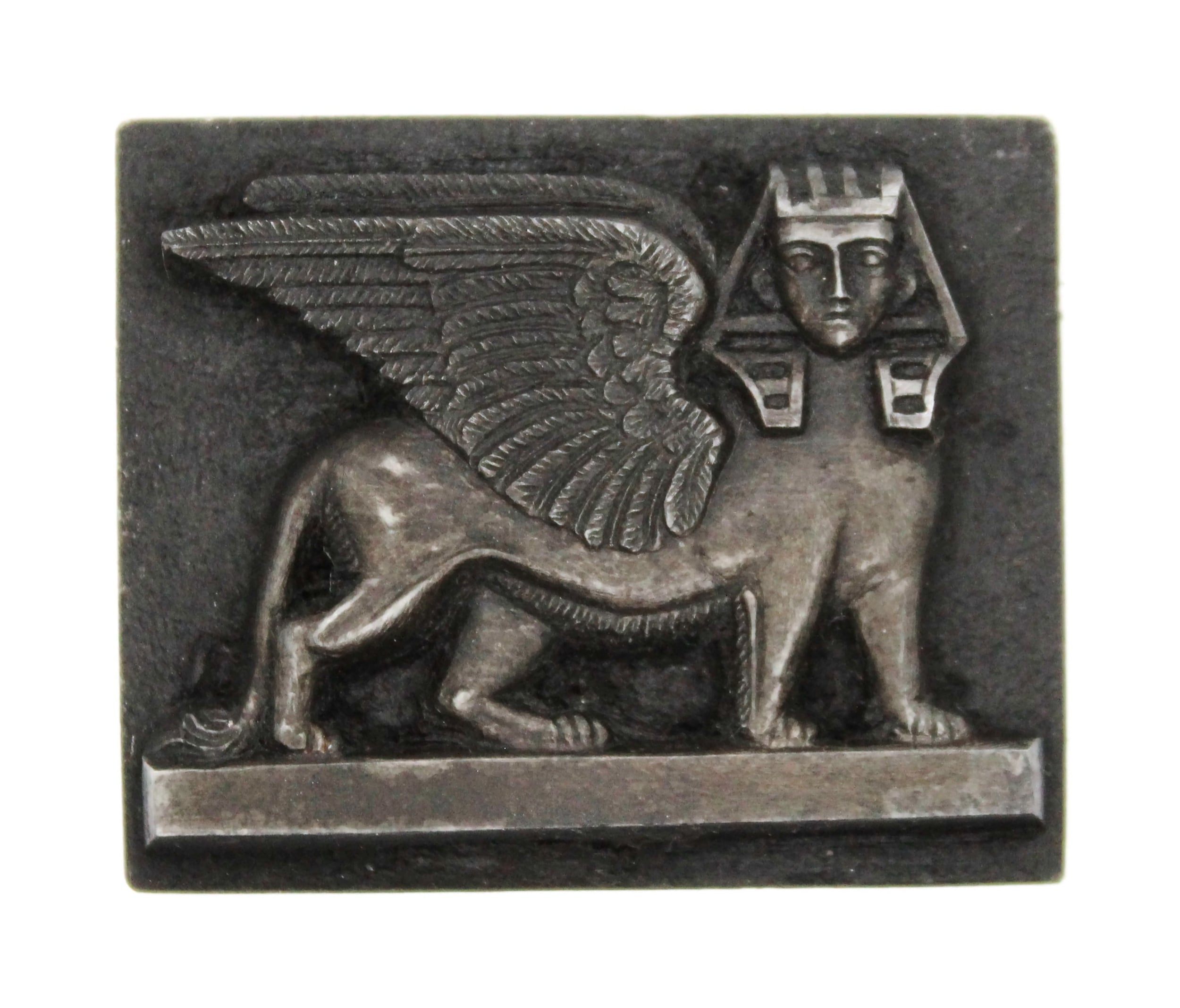 This Egyptian revival sphinx has a brother! This design contains elements of both Egyptian and Greek sphinxes. Egyptian sphinxes were wingless, predominantly male, and had the heads of pharaohs while Greek sphinxes were winged, always female, and monsters in mythology. We called it Ptolemy's Sphinx, since the Ptolemaic dynasty in Egypt was Greek. This design comes from the Ru-Mart collection. NOTE: The bar at the bottom of the hub is NOT part of the design and is easily sawed off.