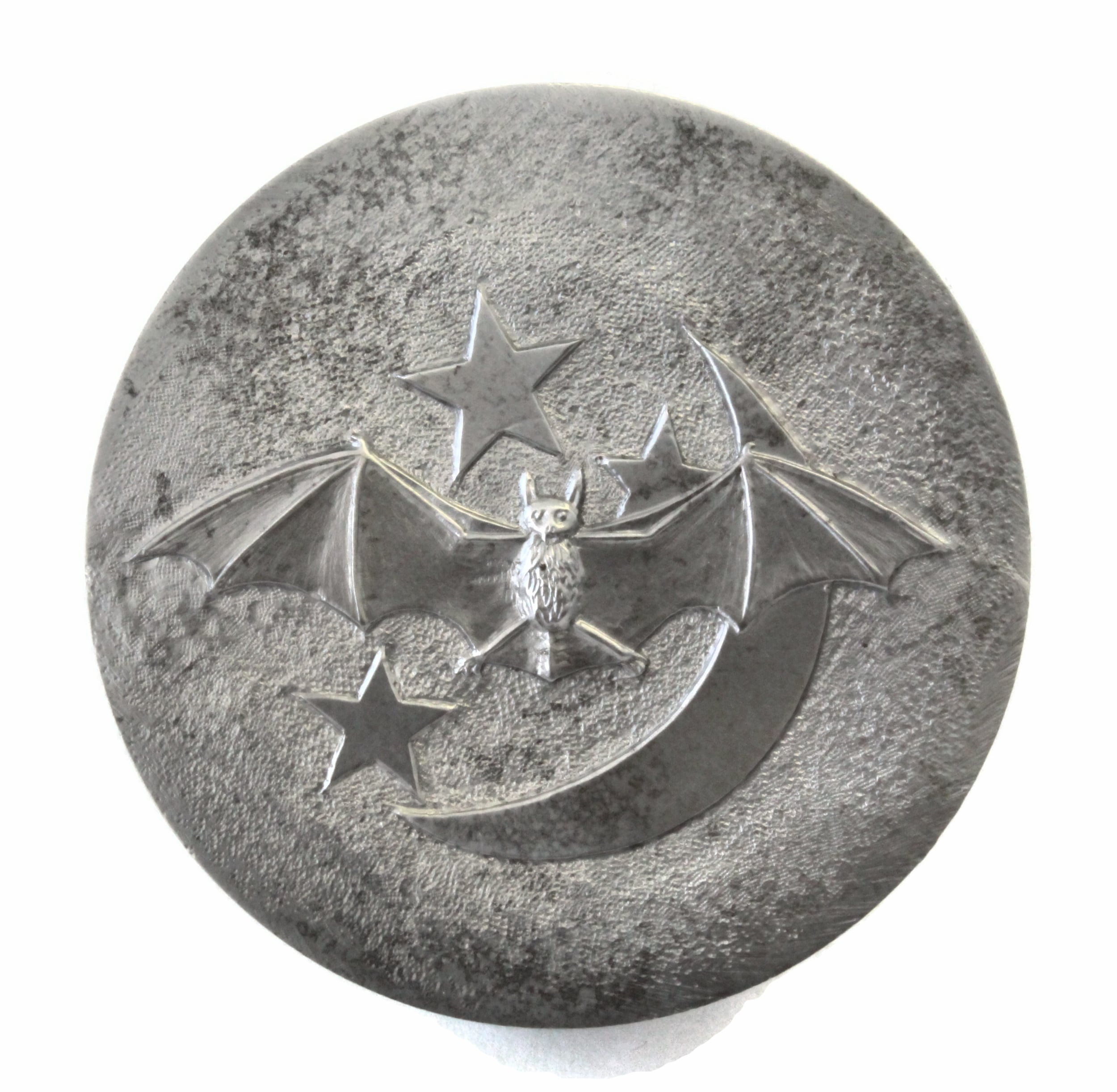 Image is 1-3/8" in diameter. Moon is 1-3/8" High and from back of moon to the farthest star, it is ~1-3/8" This impression die will be on a 2.5" or 3" die. This beautiful moon goddess, stars, and planet is carved by Ron Landis.