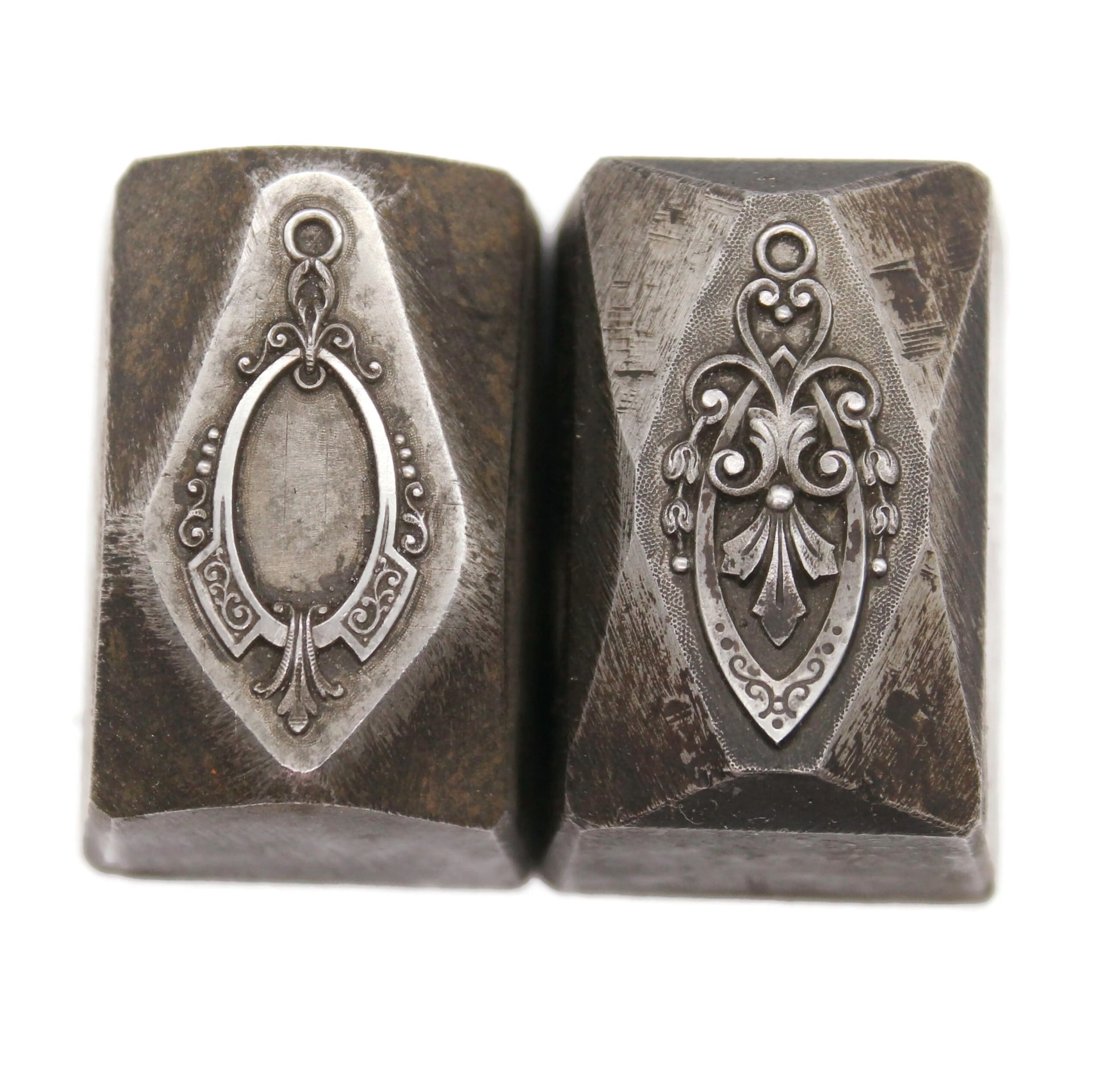 Two antique drops for the price of one! This pair of pendant/earring drops is from Rostaing out of 19th century Paris, France. There are other pairs of pendant/earring drops in this same style from Rostaing we sell separately. This pair of drops includes jump rings in the center holes. They were made to hang gemstones in the center rather than setting stones.