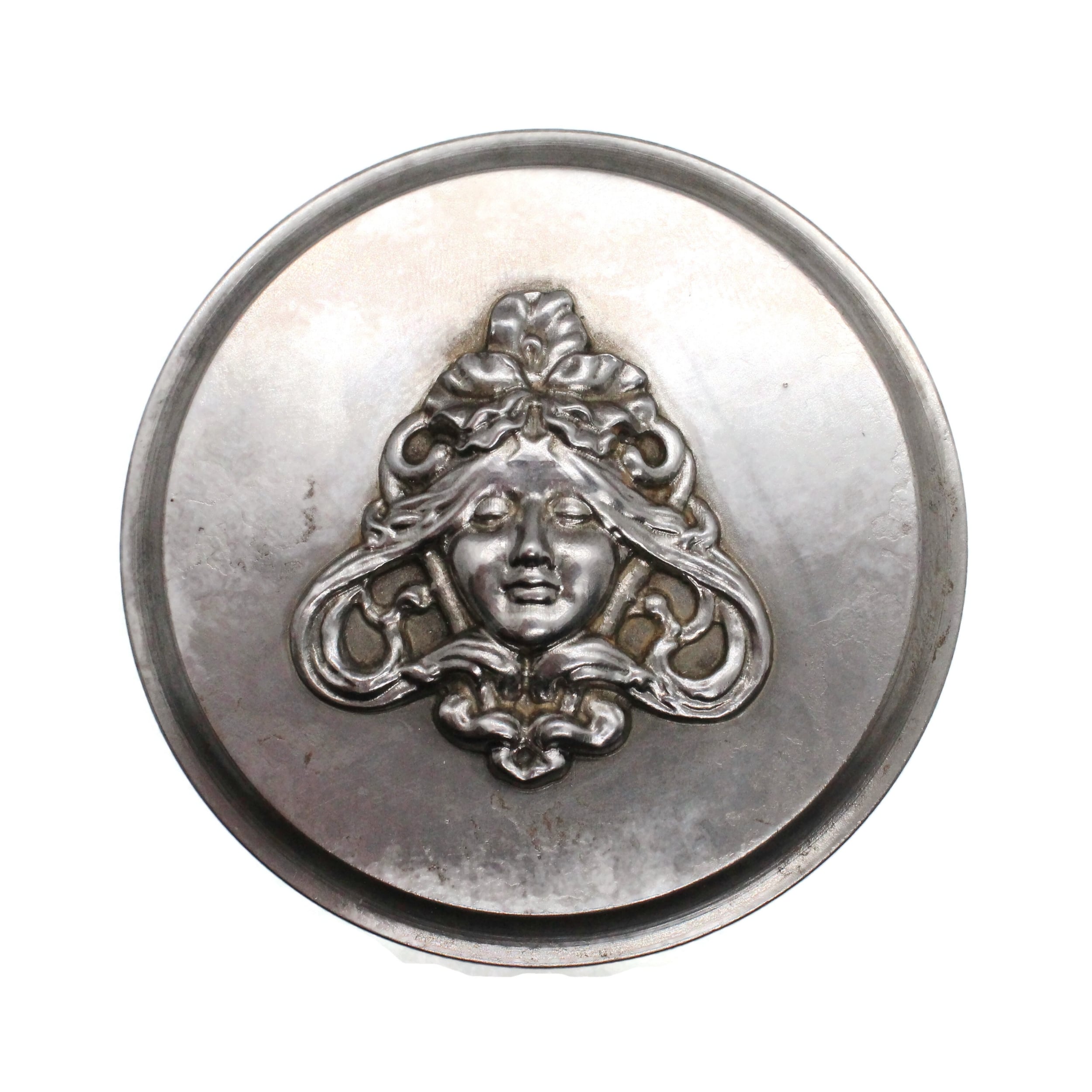 This die depicts an art nouveau woman wearing a hat and ribbon. Something like butterfly wings spread behind her. From Unger Bros.