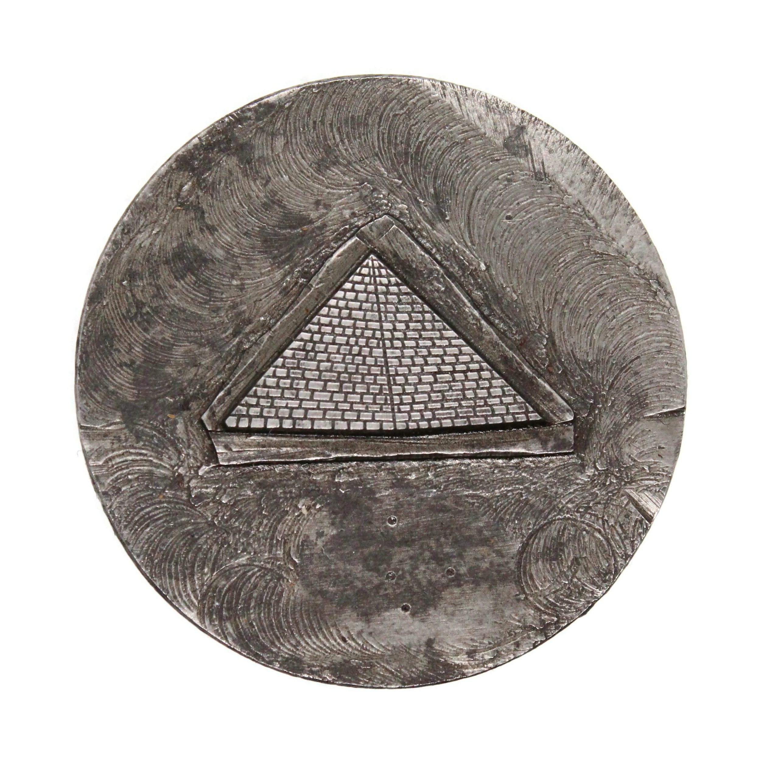 This Egyptian Revival design from the early 20th century was originally used to make large belts, brooches, and more. It depicts a stylized version of a Uraeus pair, two upright cobras, a symbol of sovereignty worn on the crowns of Egyptian kings. Above the serpents is the sun disc, a stylized winged sun that represents the Egyptian personification of the sun, Ra.