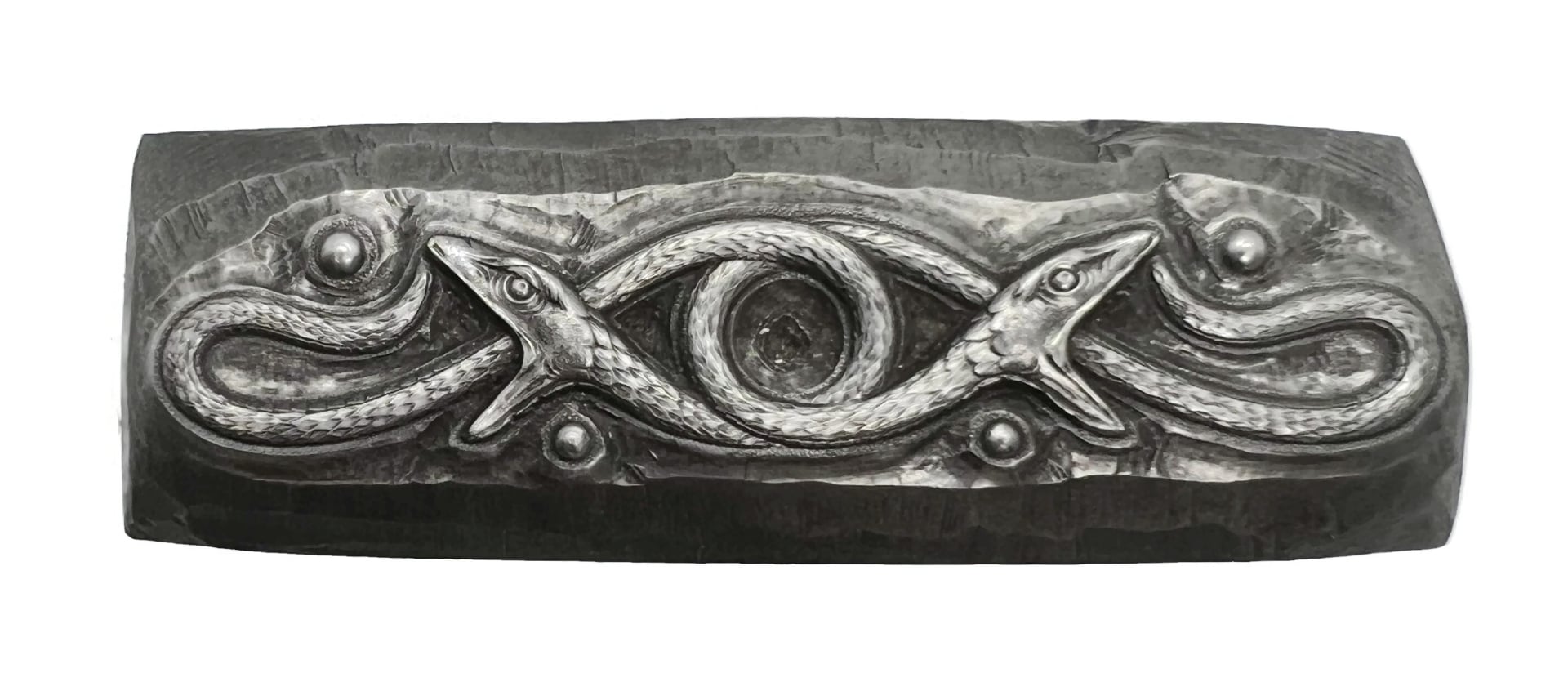 This ring was made by the La Forge Bertrand jewelry company in Paris, France circa 1910, at the beginning of that era's fascination with Egyptian revival fashion. It depicts a scarab-inspired beetle in the center flanked by smooth leaves. It can made bracelets and hair accessories as well as rings. It could even be used in leather-working.