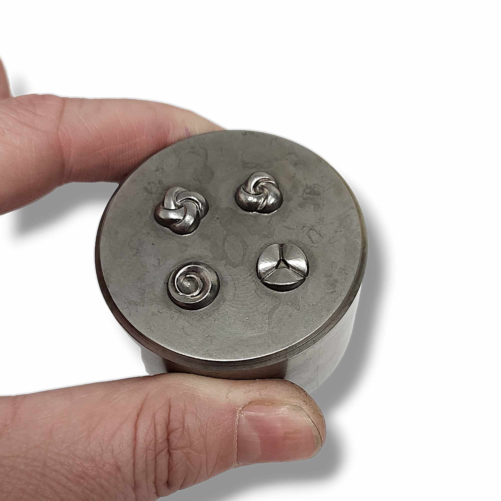 This shot plate was made in order to test the success of a shot plate subscription box. This is not a subscription box, but is an example of the sort of products that would be available in the box. The success of this shot plate will determine if we go forward with the subscription box. This shot plate includes four swirling impression dies, all from Eagle Tool.