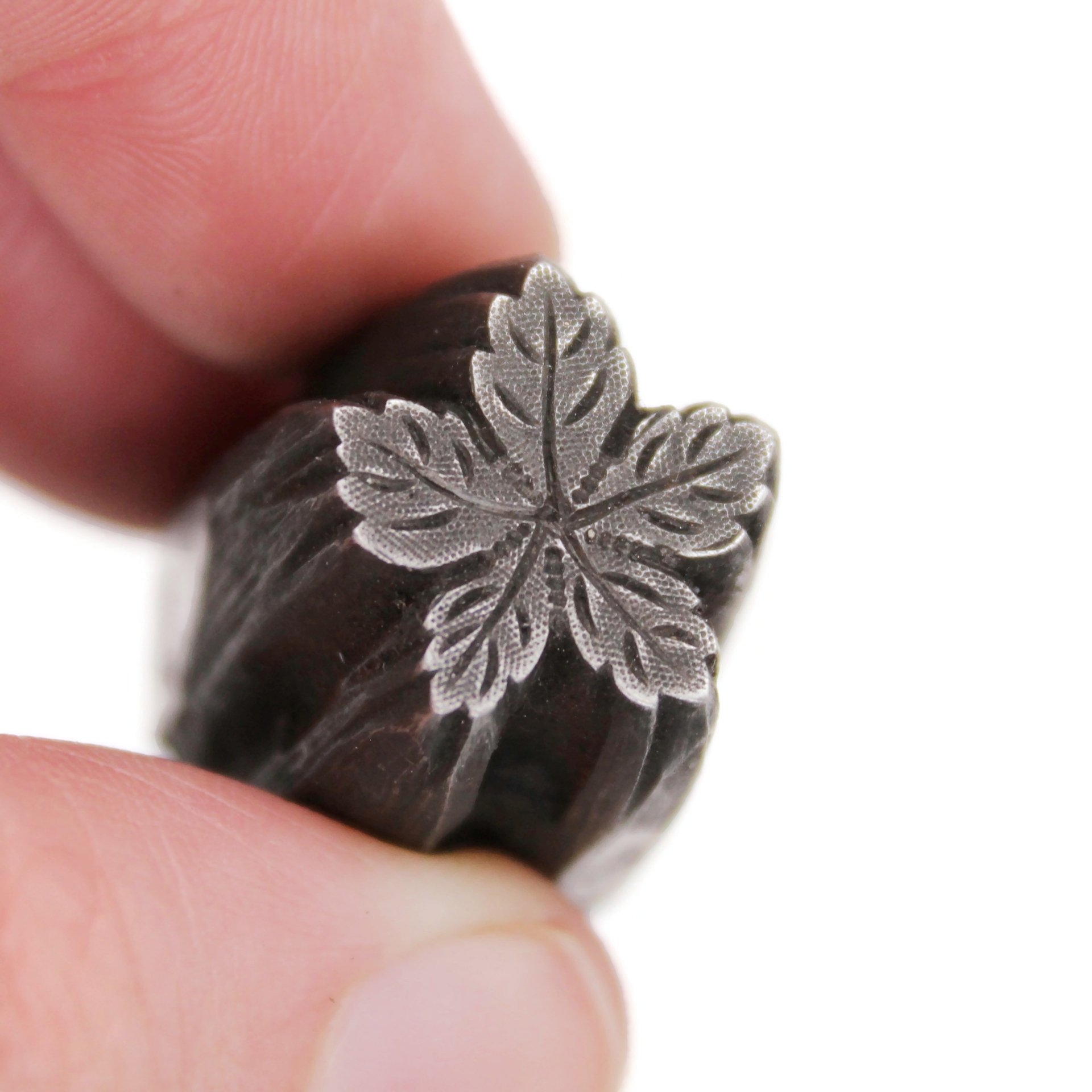 A diamond-shape button or component engraved with leaves and one ruffled edge. From Eagle Tool.