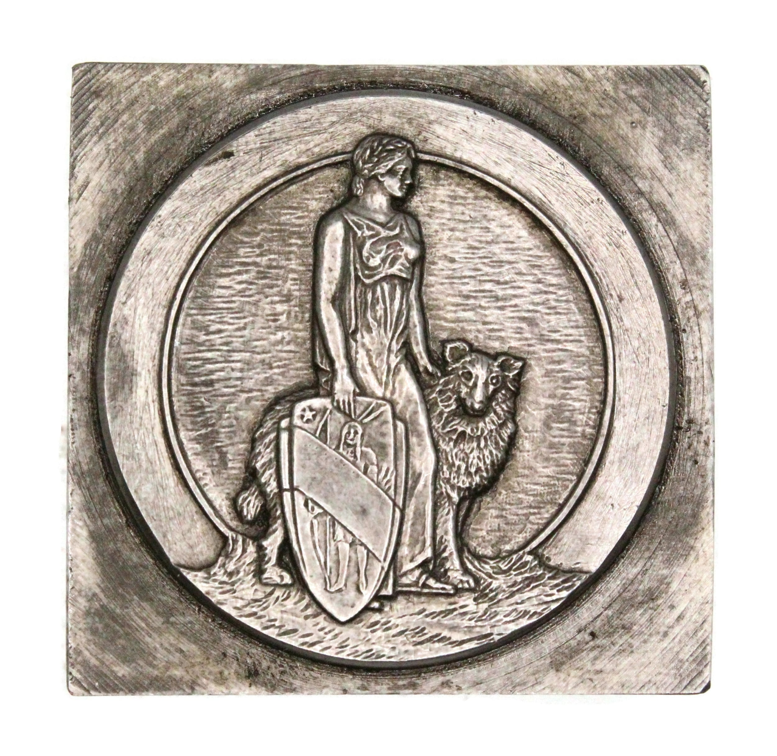 This medallion depicts a woman wearing a chiton, a common manner of dress in ancient Greece and Rome. She holds a shield on her right hand and pets a dog with her right. The shield depicts an archer beside a star. Though the origin of this design is unknown, the woman might be Artemis, the Greek goddess of the hunt, and the man on her shield might be Orion.