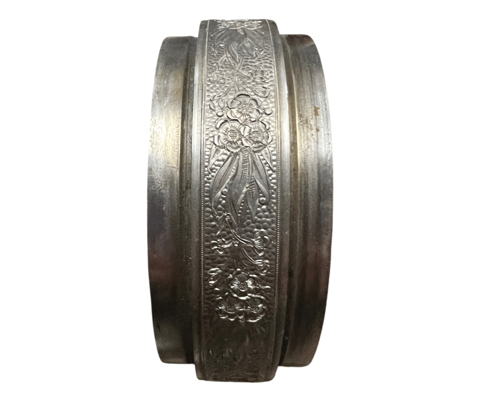 A large floral seamless pattern impression die with nouveau-inspired curls and a eye-catching flower. Soldering multiple stampings of this design together forms a continuous pattern that locks into the next stamping. From Frank Morrow Co.