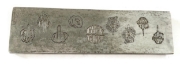 2" x ~6-7/8". Designs left to right measure 1-1/8" x 11/16", 15/16" x 9/16", 13/16" diameter, 1-3/16" diameter, 5/8" x 15/16"