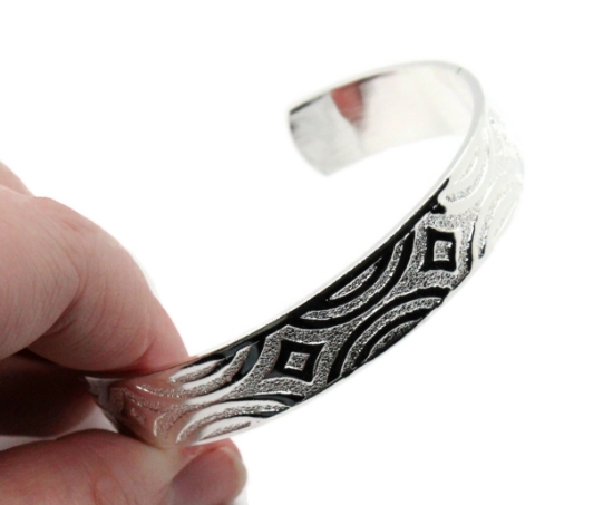 Each cuff is approximately 6.5" long. The bracelet is made from 16-gauge copper that has been coated with a heavy-duty industrial silver plating (with a nickel base layer), similar to the heavy silver-plate of silverware. CANNOT be soldered, filed, or sanded (plating will be removed). CAN be lightly polished, slightly re-formed with non-marring forming tools, and patinated. Bracelets are all made from the same pattern but because they are rolled by hand they may have some inconsistencies and not be exactly identical. The inside surface and edges of the cuff may have small dings, scratches, and other imperfections; these are not considered defects. NOTE: This batch is NOT stamped "Silver Plated." Width: 1/2"