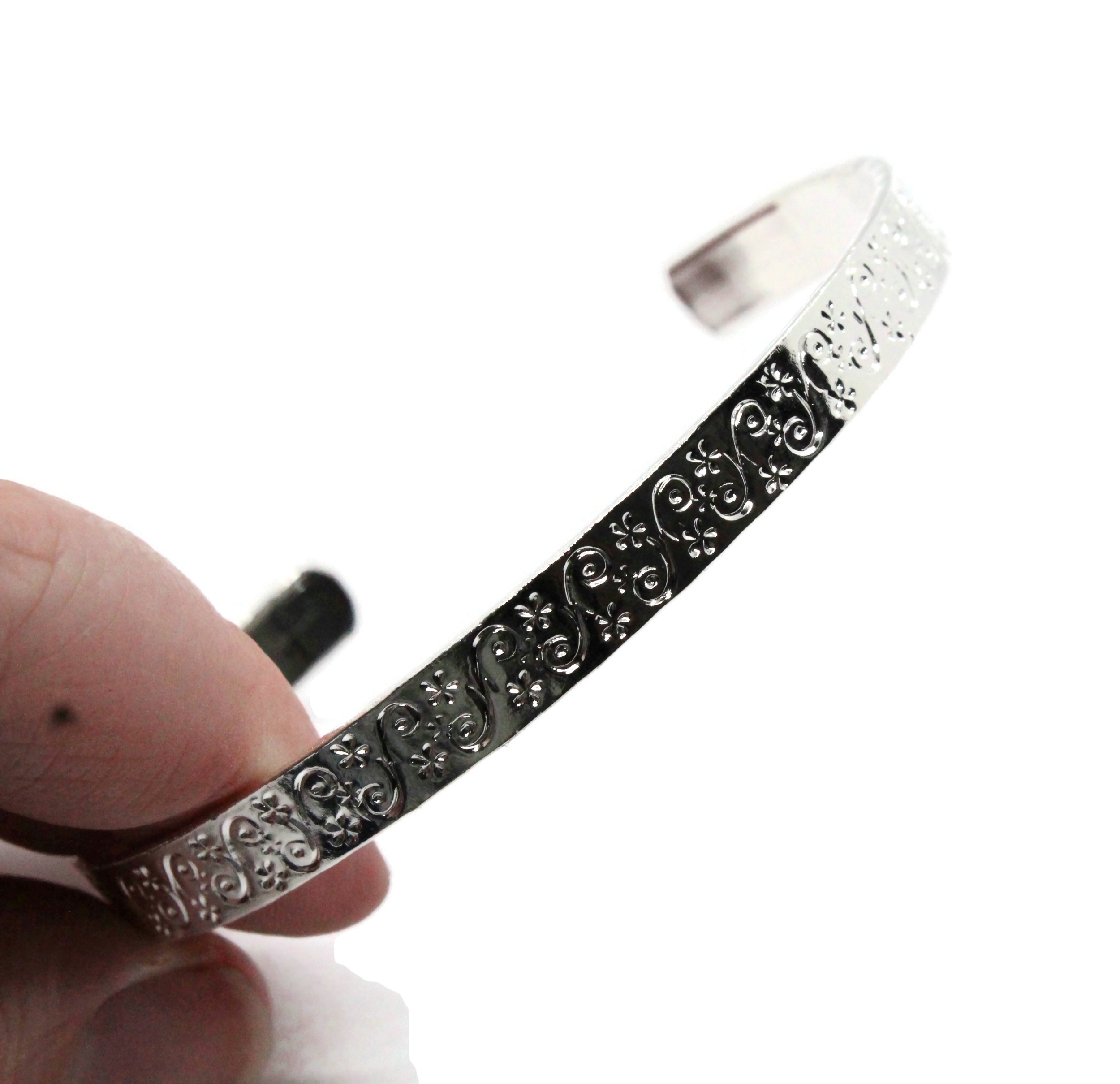 Each cuff is approximately 6.5" long. The bracelet is made from 16-gauge copper that has been coated with a heavy-duty industrial silver plating (with a nickel base layer), similar to the heavy silver-plate of silverware. CANNOT be soldered, filed, or sanded (plating will be removed). CAN be lightly polished, slightly re-formed with non-marring forming tools, and patinated. Bracelets are all made from the same pattern but because they are rolled by hand they may have some inconsistencies and not be exactly identical. The inside surface and edges of the cuff may have small dings, scratches, and other imperfections; these are not considered defects. NOTE: This batch is NOT stamped "Silver Plated." Width: 1/2"