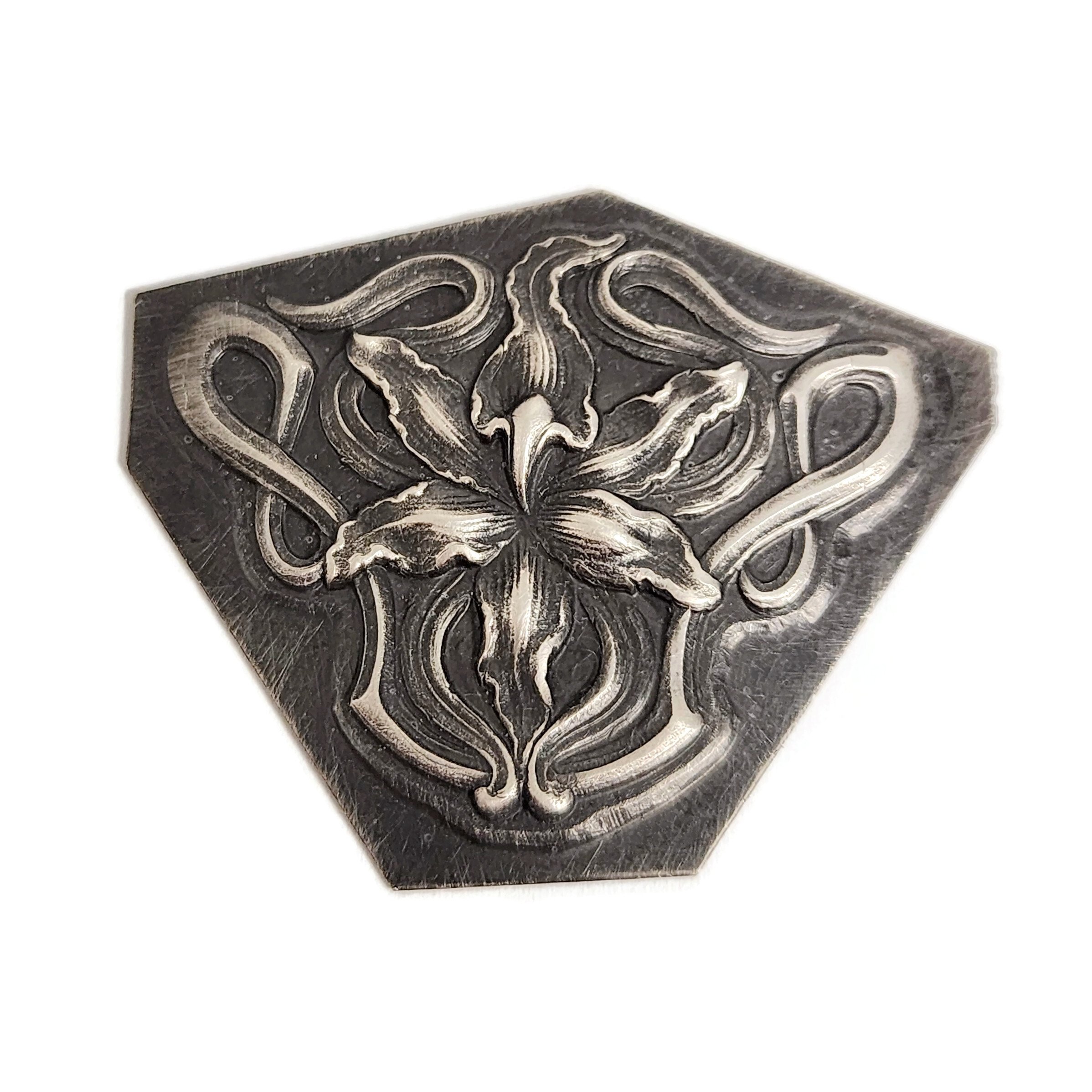 Approx. 16 gauge sterling silver (due to supply challenges gauges may vary) Design: 36.3 x 46.2mm NOTE: Each stamping is made in-house, one-at-a-time, using vintage tools and processes. The detail in each stamping may vary, and a stamping with less detail is not considered defective.
