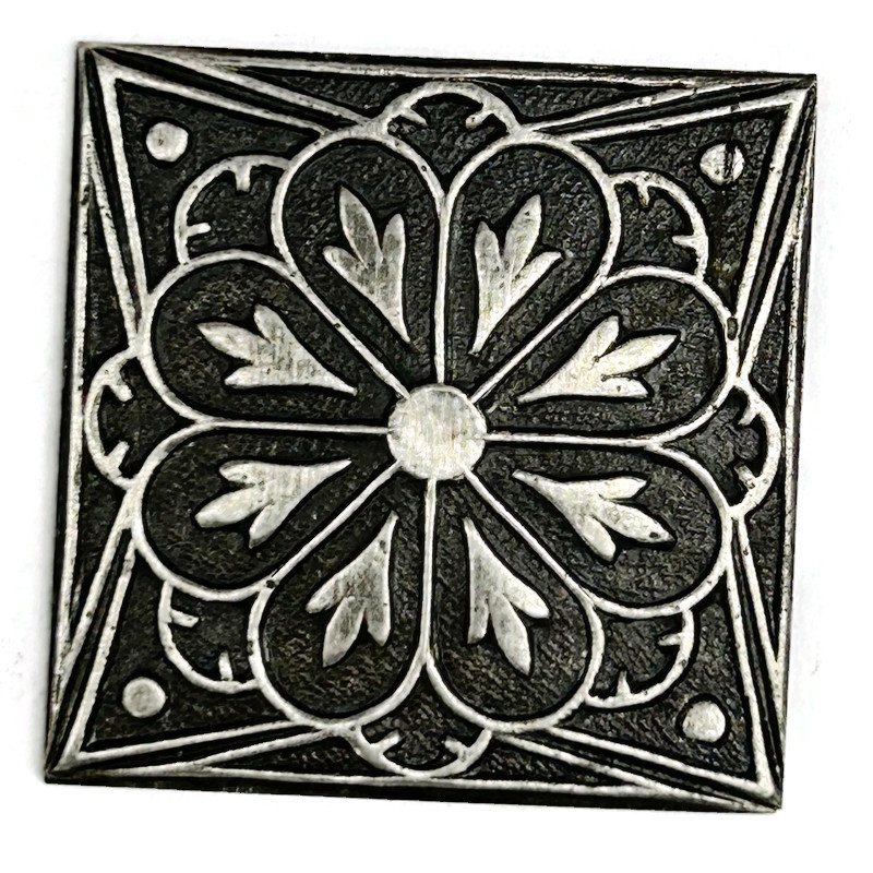 Approx. 16 gauge (Due to supply challenges, gauge may vary.) Design: 1" x 1" NOTE: Each stamping is made in house, one at a time, using vintage tools and processes. The detail in each stamping may vary, and a stamping with less detail is not considered defective.
