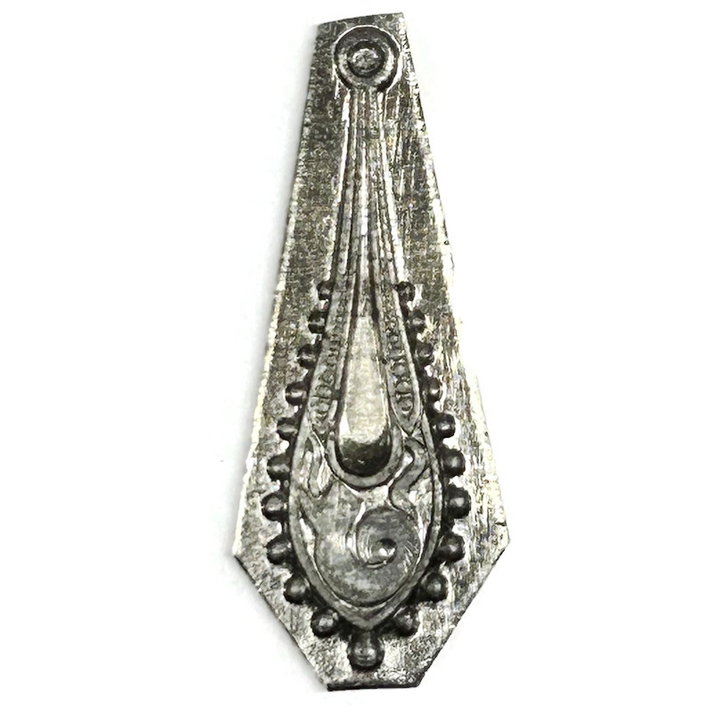 Approx. 16 gauge (Due to supply challenges, gauge may vary.) Design: 3/8" x 1-1/4" NOTE: Each stamping is made in house, one at a time, using vintage tools and processes. The detail in each stamping may vary, and a stamping with less detail is not considered defective.